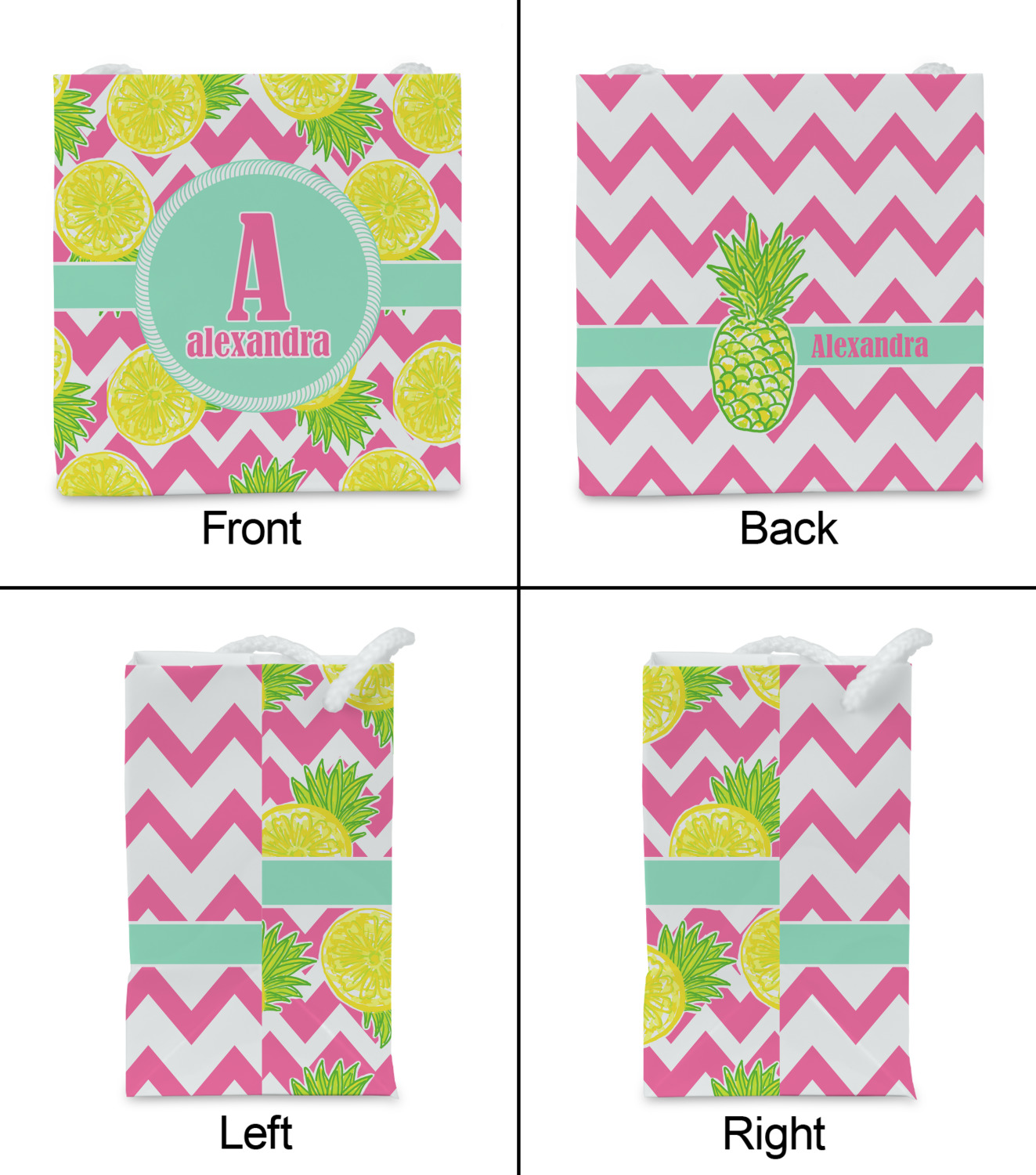 The main design has a background with bright pink and white chevron with some crazy yellow and lime pineapple slices scattered on top. A soft mint color is used for the ribbon and label, while a pink is used for the personalized name and initial.