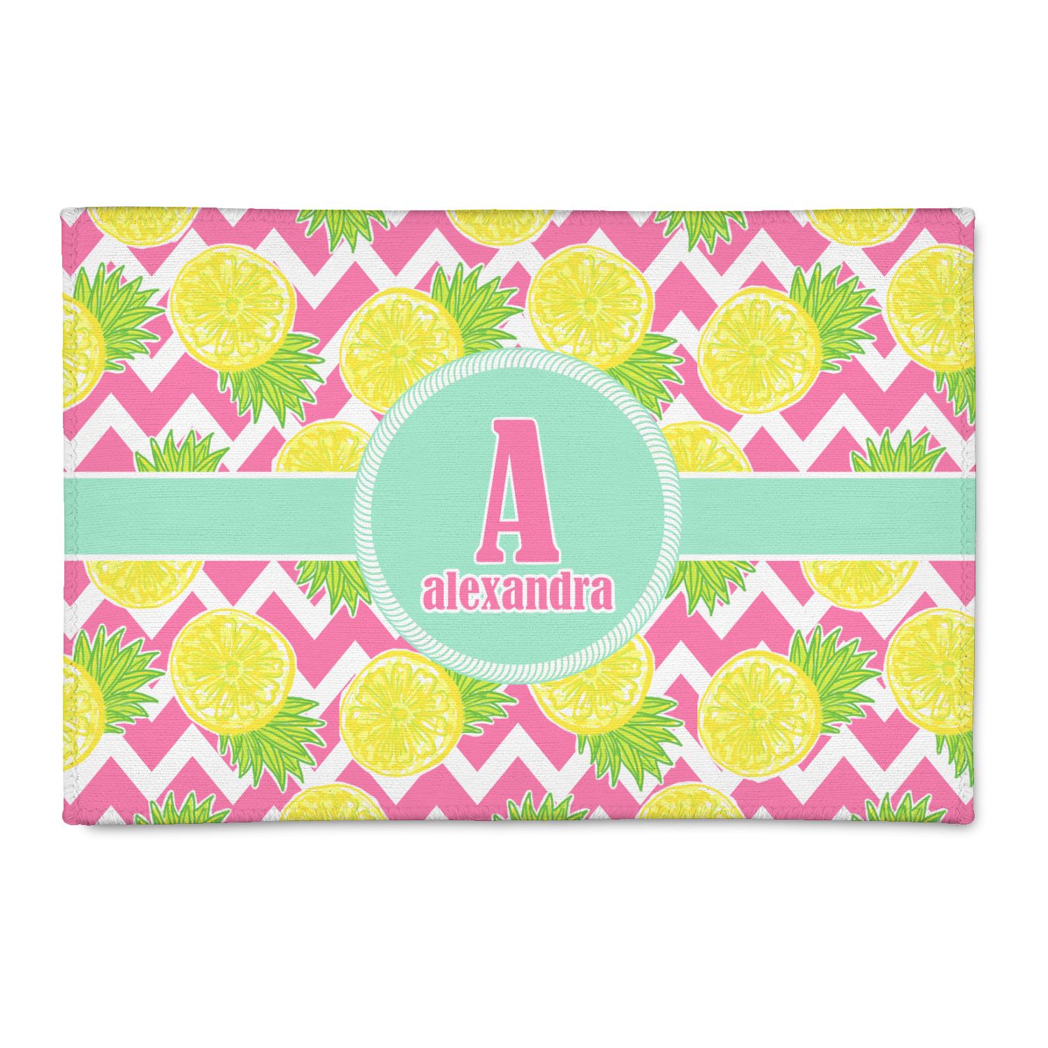 The main design has a background with bright pink and white chevron with some crazy yellow and lime pineapple slices scattered on top. A soft mint color is used for the ribbon and label, while a pink is used for the personalized name and initial.