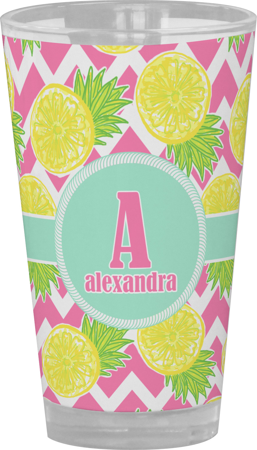 The main design has a background with bright pink and white chevron with some crazy yellow and lime pineapple slices scattered on top. A soft mint color is used for the ribbon and label, while a pink is used for the personalized name and initial.
