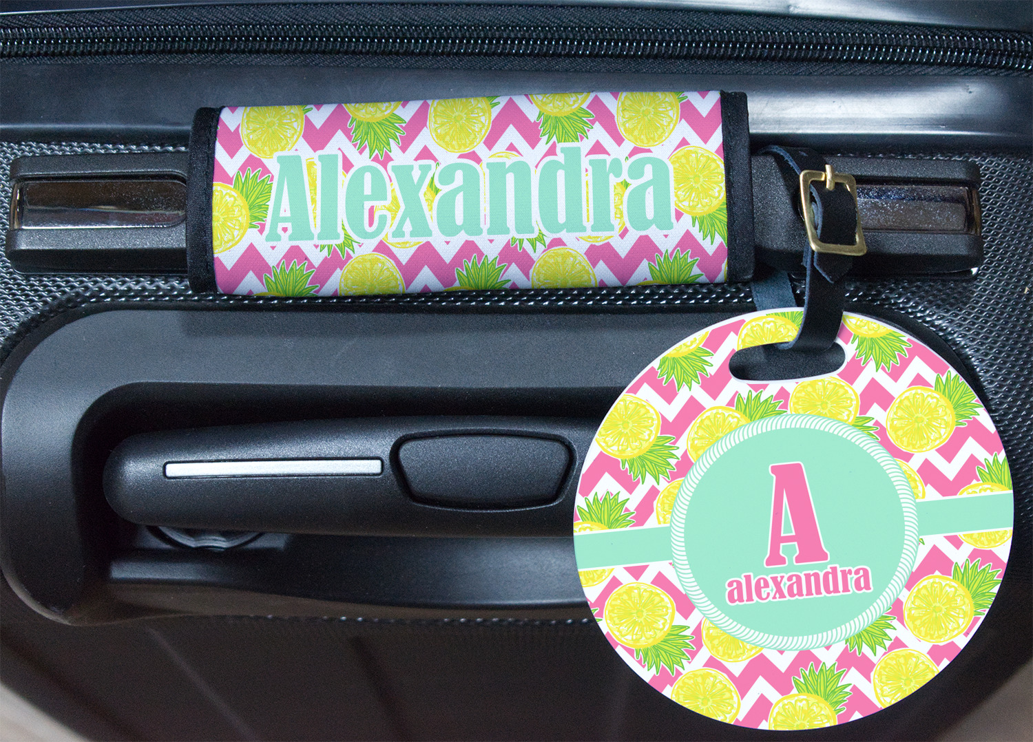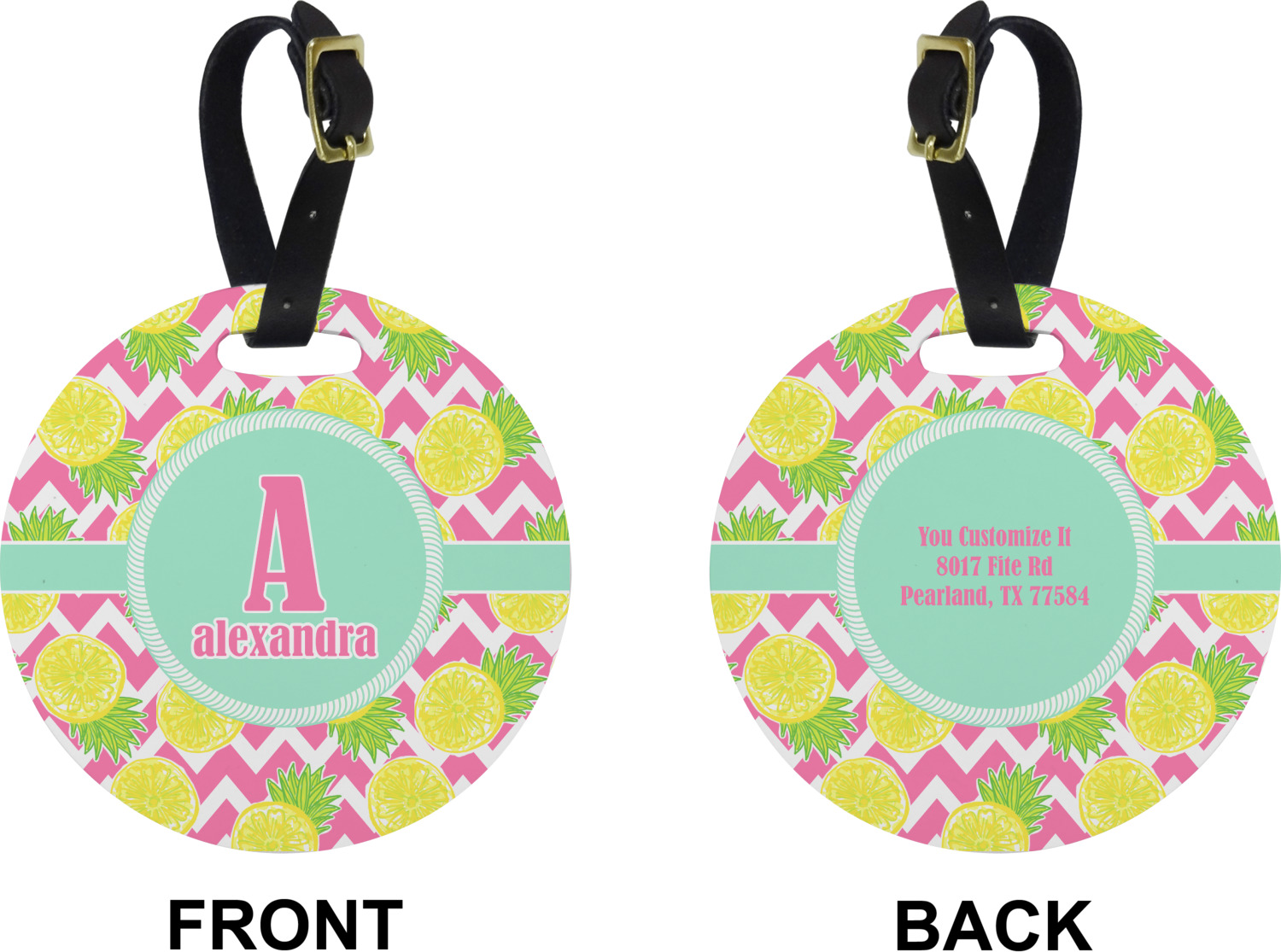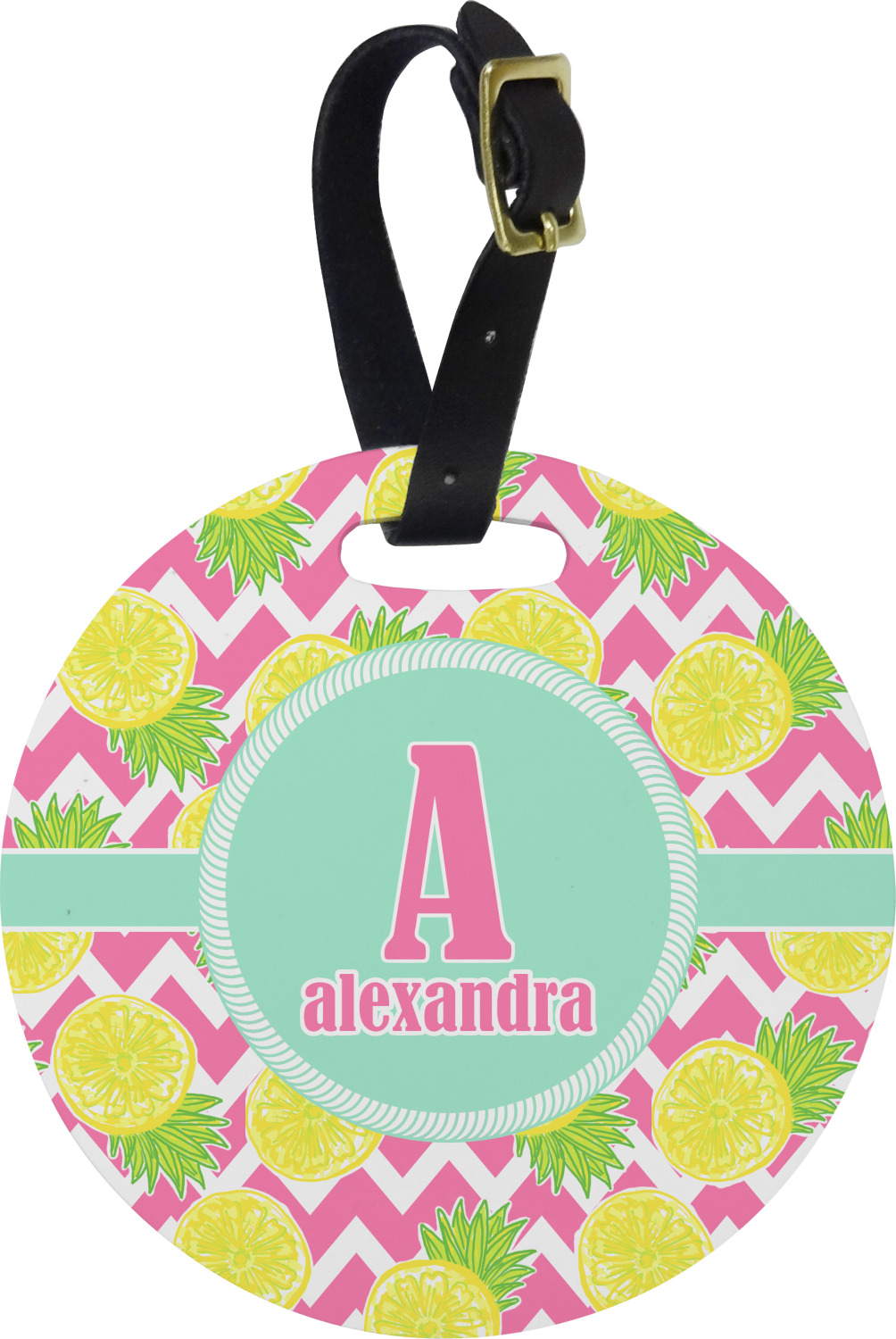 The main design has a background with bright pink and white chevron with some crazy yellow and lime pineapple slices scattered on top. A soft mint color is used for the ribbon and label, while a pink is used for the personalized name and initial.
