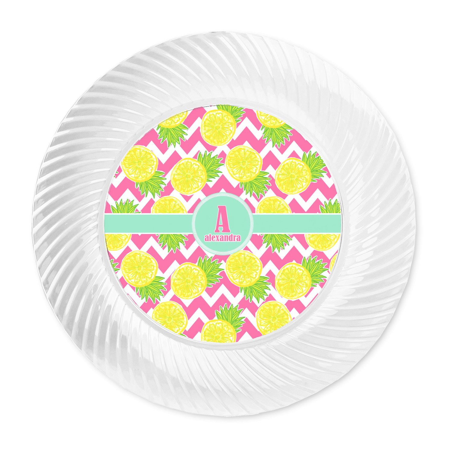 The main design has a background with bright pink and white chevron with some crazy yellow and lime pineapple slices scattered on top. A soft mint color is used for the ribbon and label, while a pink is used for the personalized name and initial.