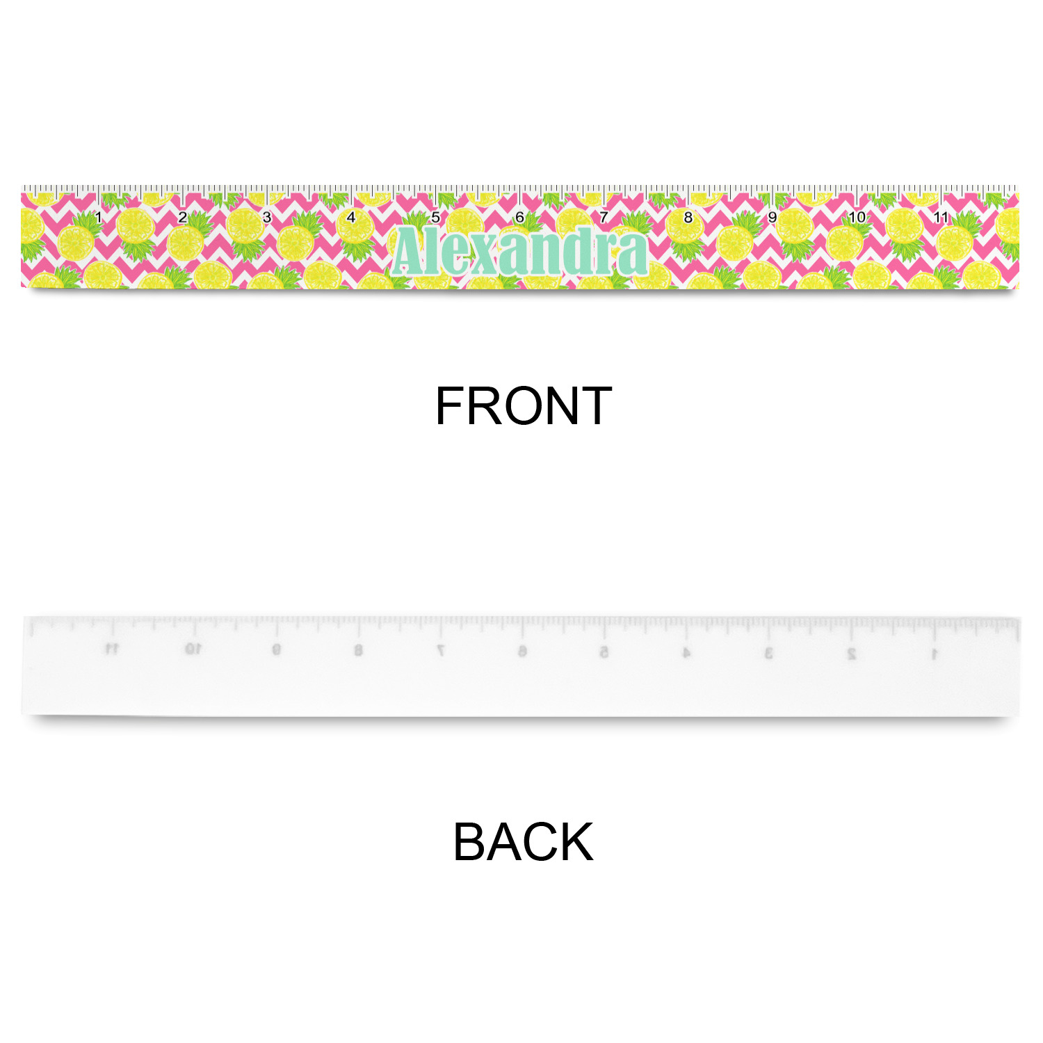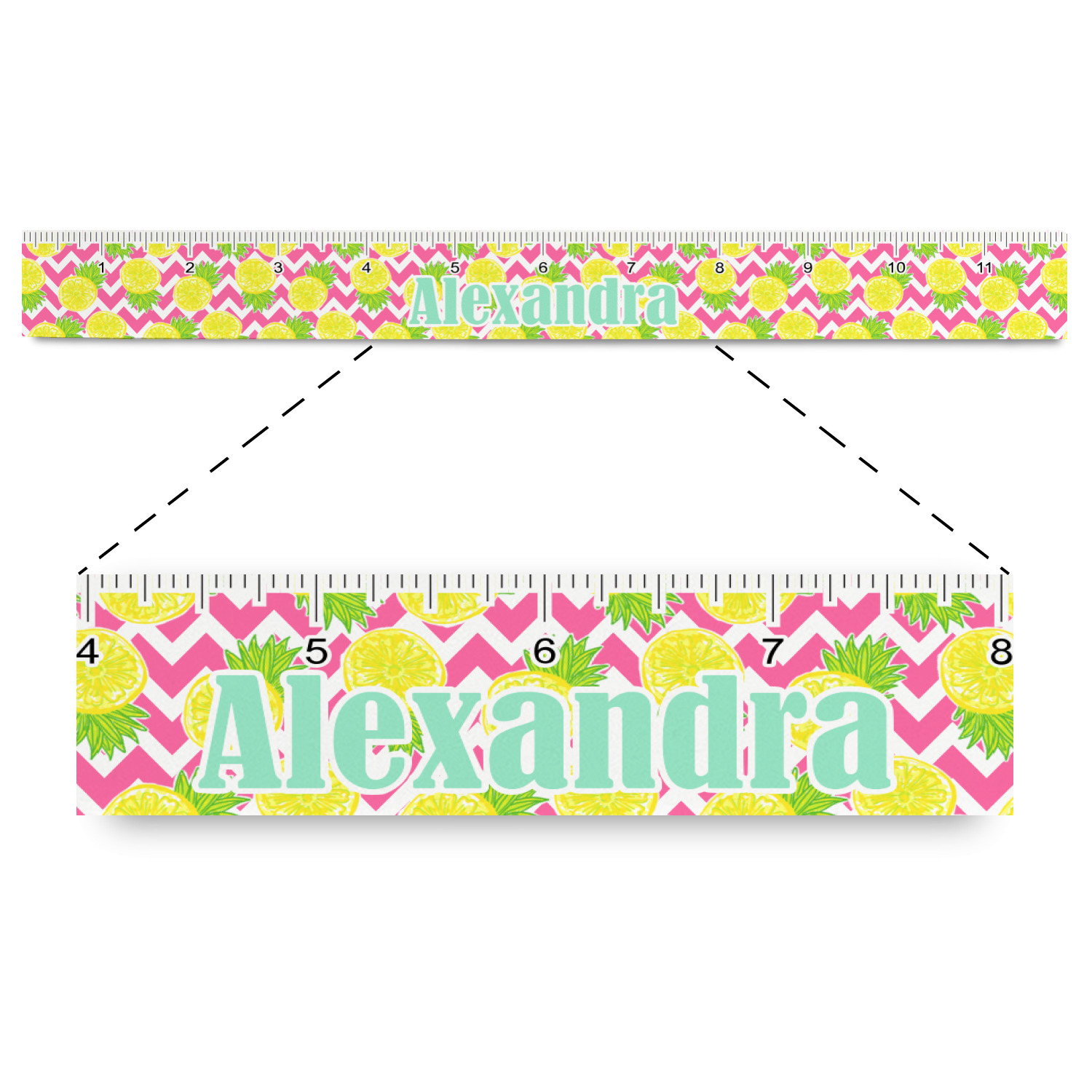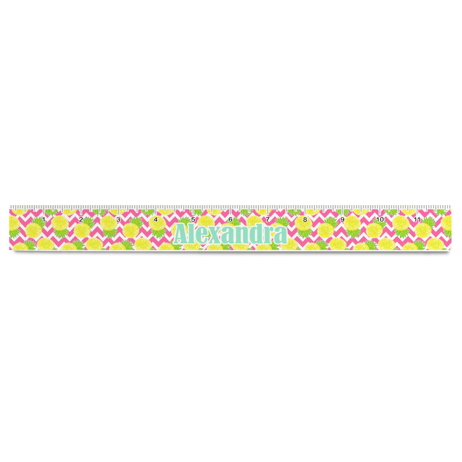 The main design has a background with bright pink and white chevron with some crazy yellow and lime pineapple slices scattered on top. A soft mint color is used for the ribbon and label, while a pink is used for the personalized name and initial.