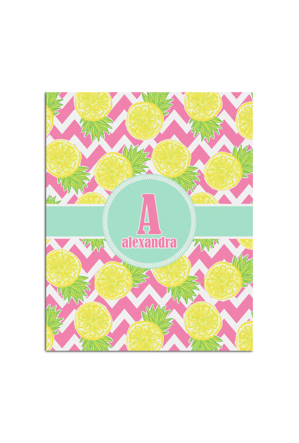 The main design has a background with bright pink and white chevron with some crazy yellow and lime pineapple slices scattered on top. A soft mint color is used for the ribbon and label, while a pink is used for the personalized name and initial.