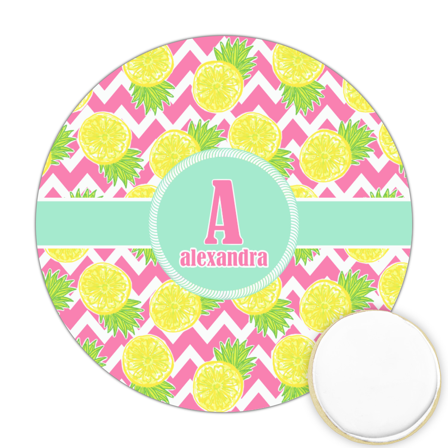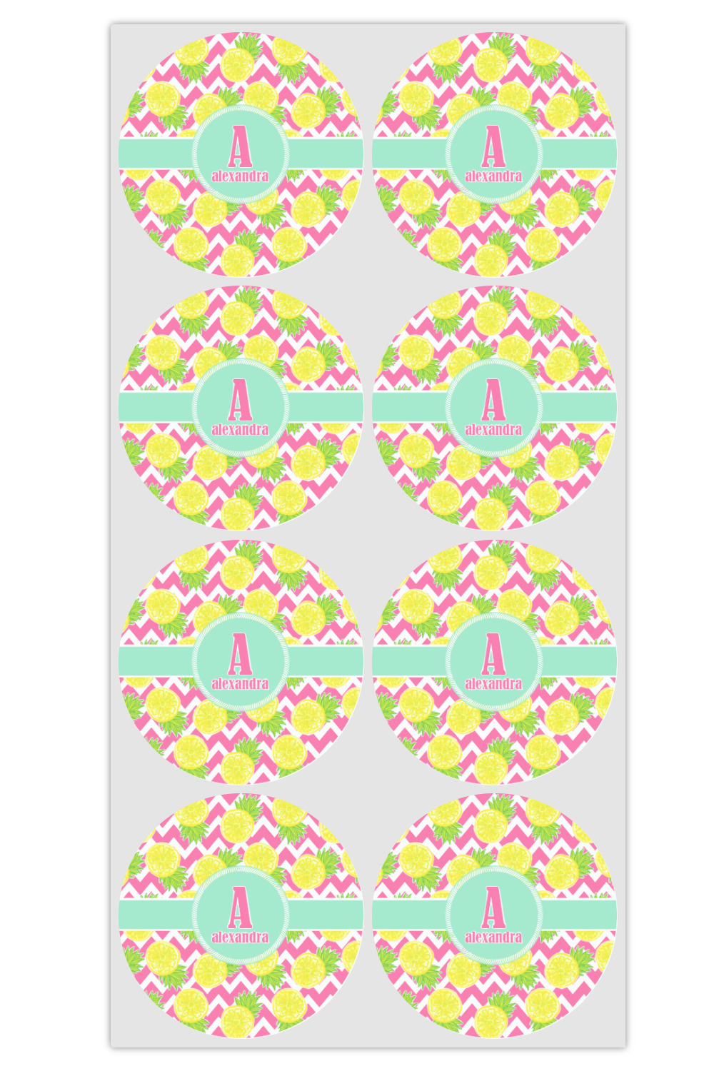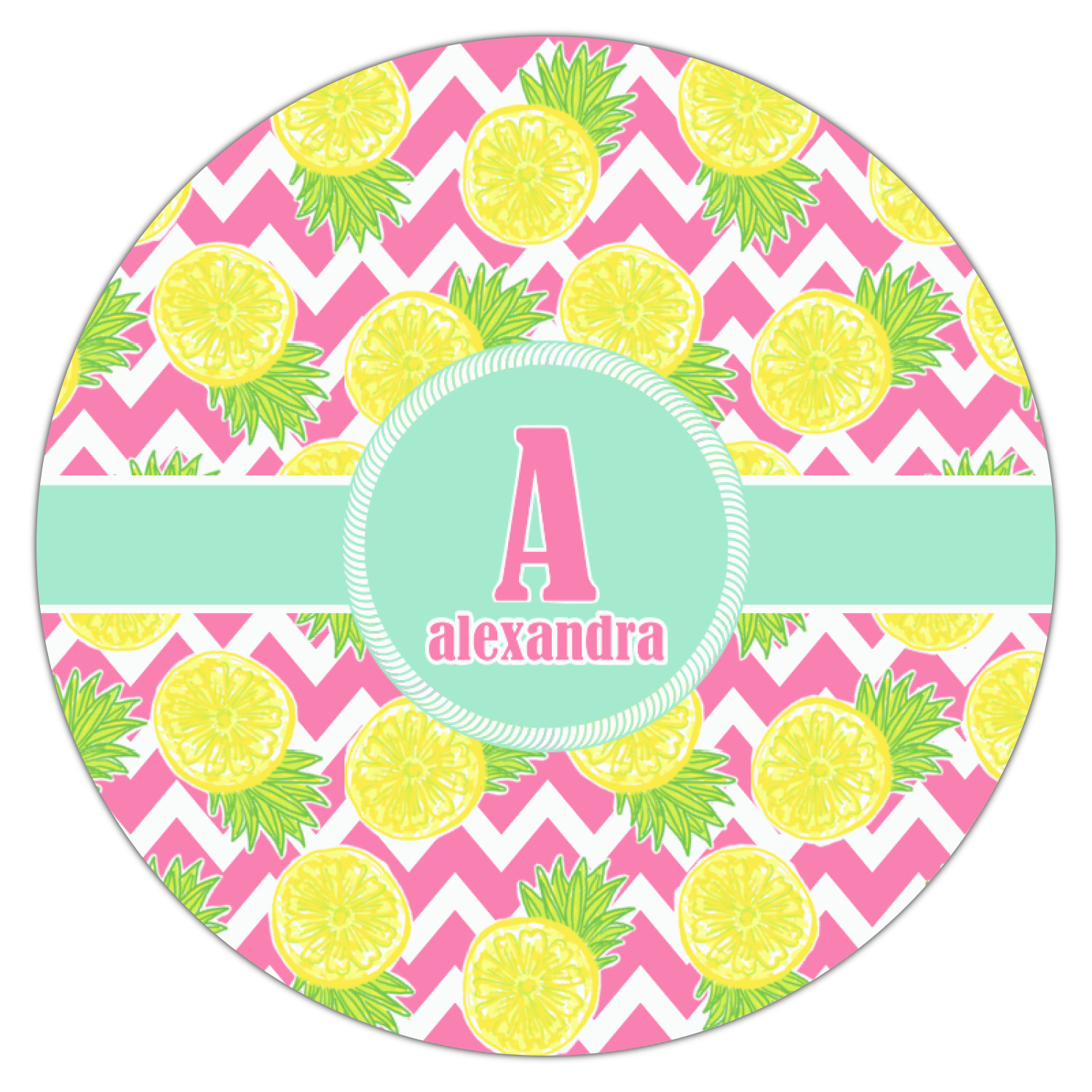 The main design has a background with bright pink and white chevron with some crazy yellow and lime pineapple slices scattered on top. A soft mint color is used for the ribbon and label, while a pink is used for the personalized name and initial.