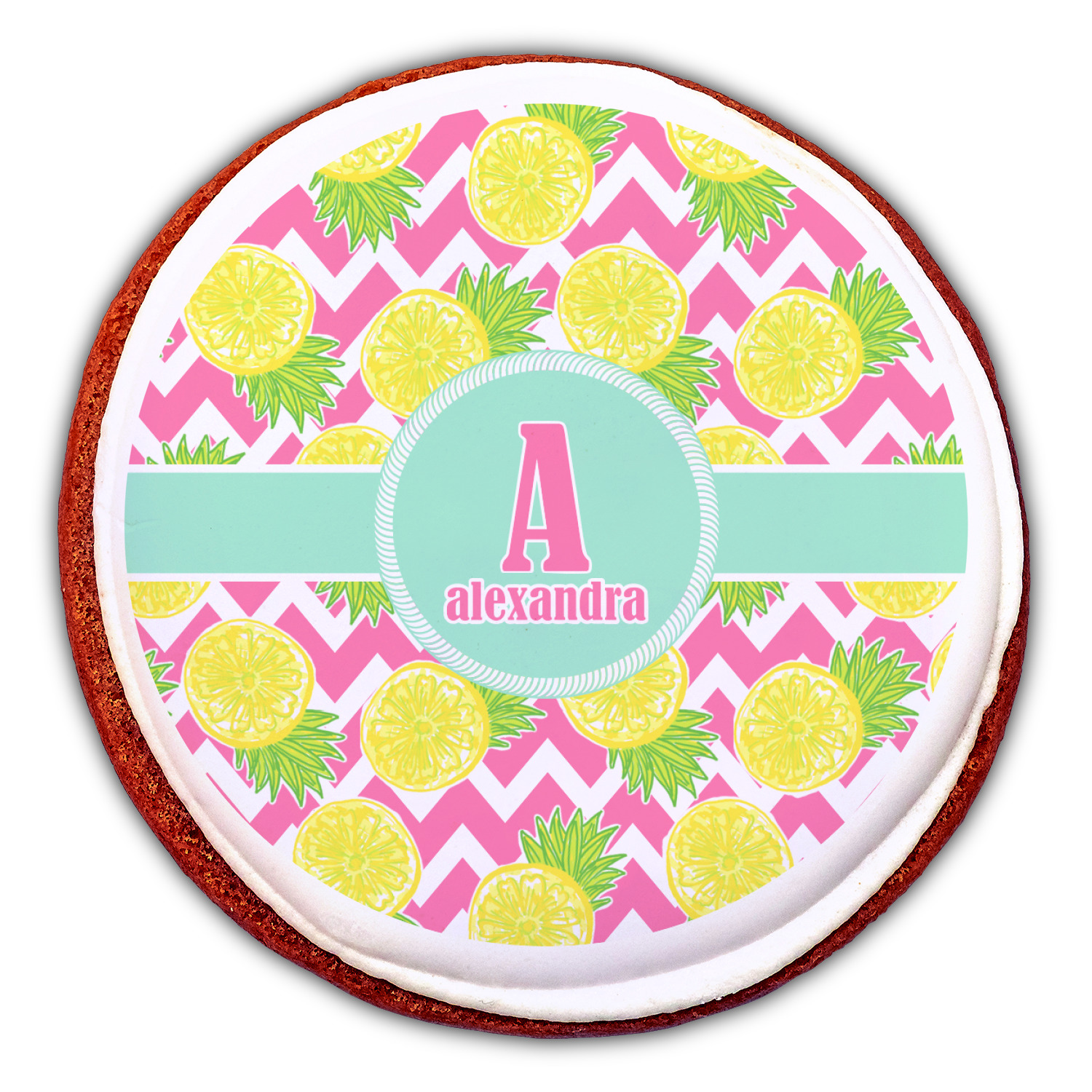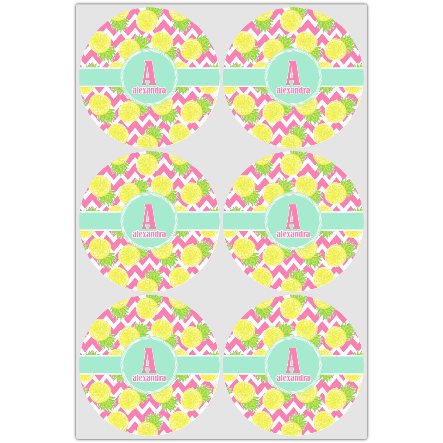 The main design has a background with bright pink and white chevron with some crazy yellow and lime pineapple slices scattered on top. A soft mint color is used for the ribbon and label, while a pink is used for the personalized name and initial.
