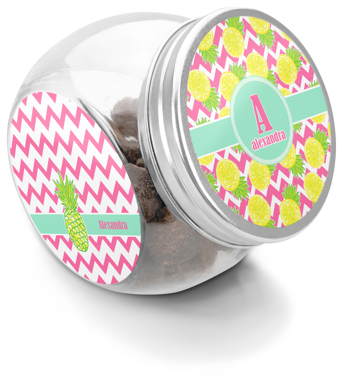 The main design has a background with bright pink and white chevron with some crazy yellow and lime pineapple slices scattered on top. A soft mint color is used for the ribbon and label, while a pink is used for the personalized name and initial.