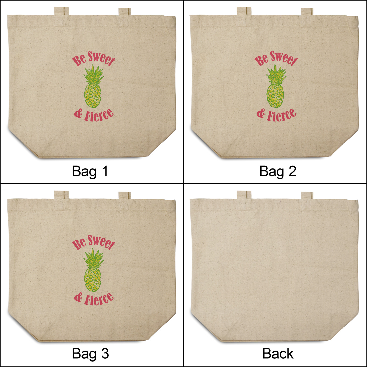 These cotton totes are washable and easy to care for, and they can be folded flat for storage. Your artwork, logo, or photo is printed in full color directly on the cotton tote in the front.