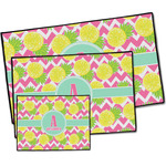 The coordinating design has a large, bright pineapple on the left side with a mint ribbon running behind it. On the right side of the ribbon is the personalized text. The background is a bright pink and white chevron. You are sure to be noticed with this bright design!