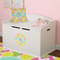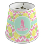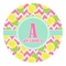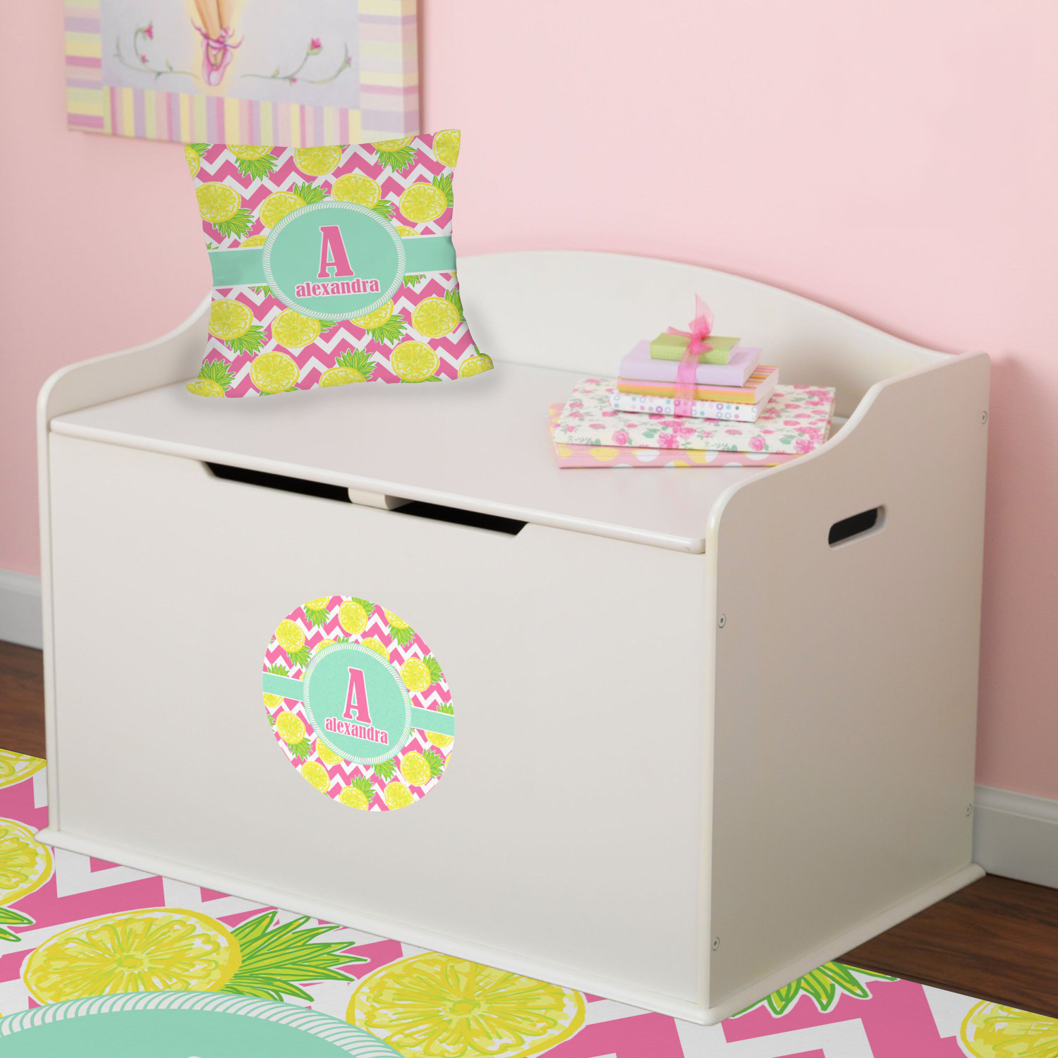 The main design has a background with bright pink and white chevron with some crazy yellow and lime pineapple slices scattered on top. A soft mint color is used for the ribbon and label, while a pink is used for the personalized name and initial.
