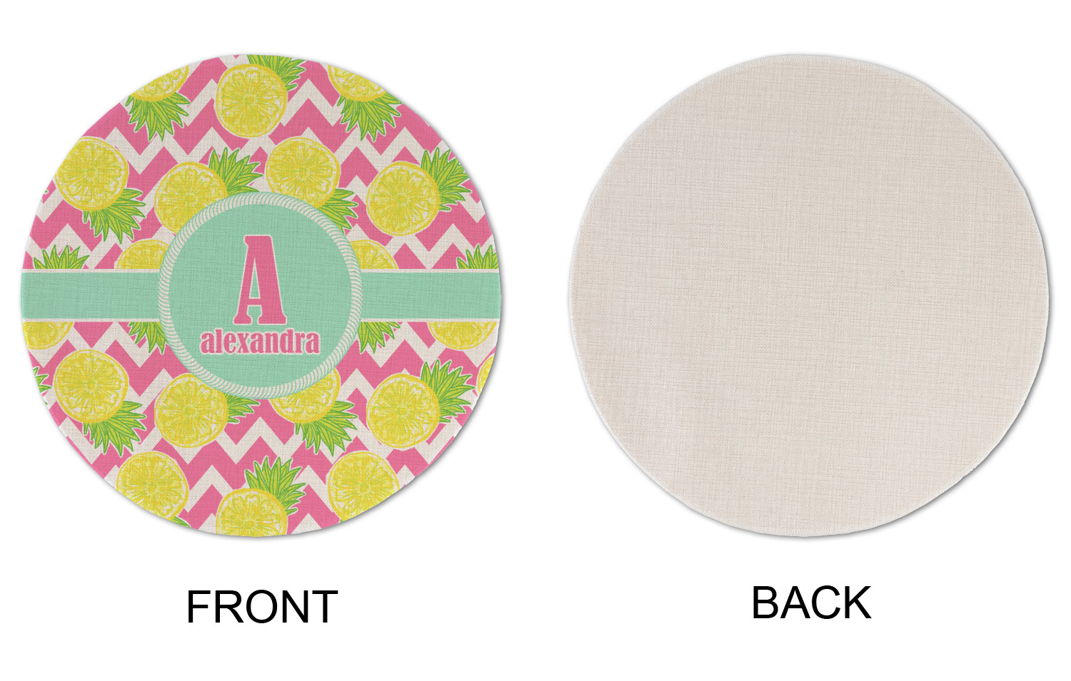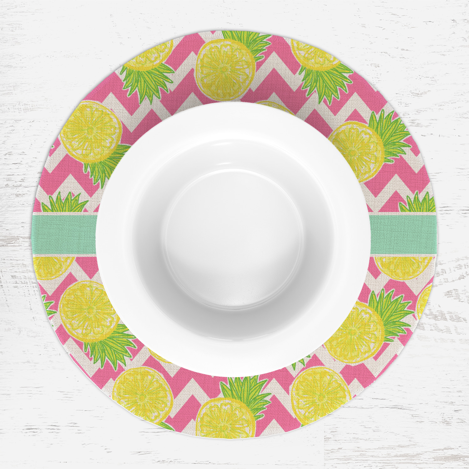 The main design has a background with bright pink and white chevron with some crazy yellow and lime pineapple slices scattered on top. A soft mint color is used for the ribbon and label, while a pink is used for the personalized name and initial.