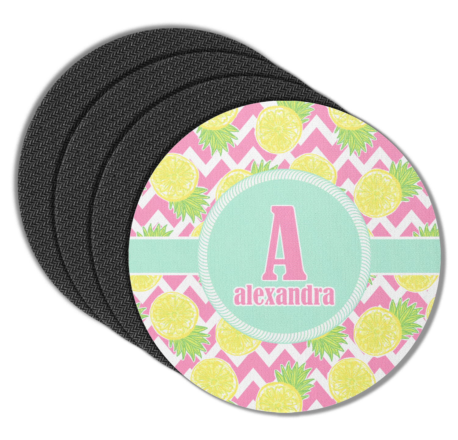 The main design has a background with bright pink and white chevron with some crazy yellow and lime pineapple slices scattered on top. A soft mint color is used for the ribbon and label, while a pink is used for the personalized name and initial.