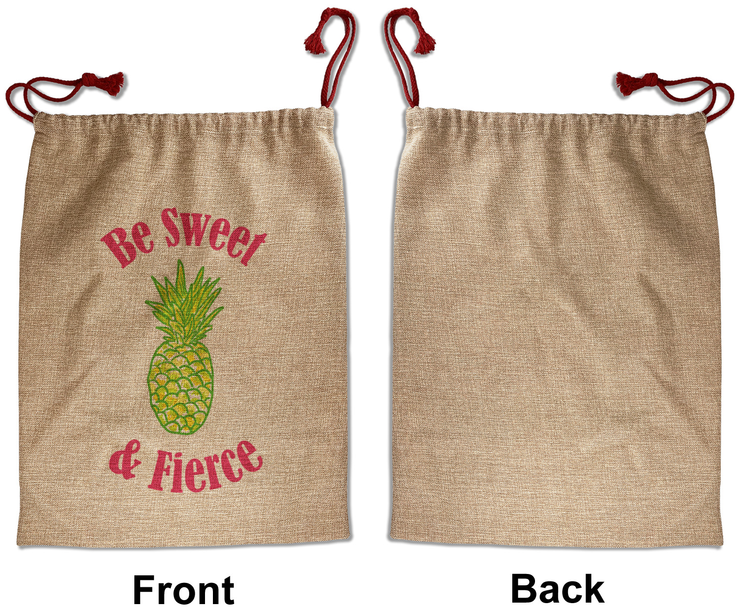 Our Santa sacks print your design on the burlap material giving it a nice rustic, natural design! The burlap material is also machine washable and wrinkle-free, so feel free to fold and store out Santa bags until the next time you need it! Secure your gifts with our red accent drawstring ties at the top of the sack so the mystery of your gift stays a surprise until Christmas day. We offer two types of printing- one side partial print or double-sided partial printing. Design and personalize your own Santa sack in time for the holidays!