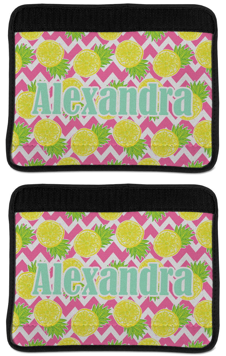 The main design has a background with bright pink and white chevron with some crazy yellow and lime pineapple slices scattered on top. A soft mint color is used for the ribbon and label, while a pink is used for the personalized name and initial.