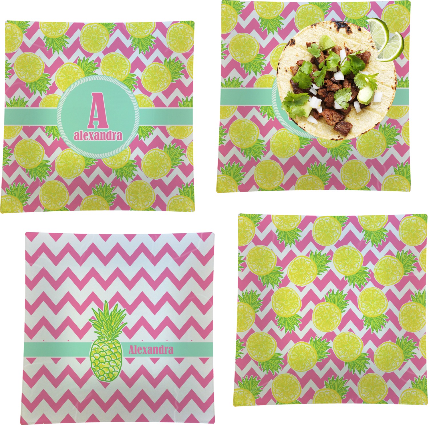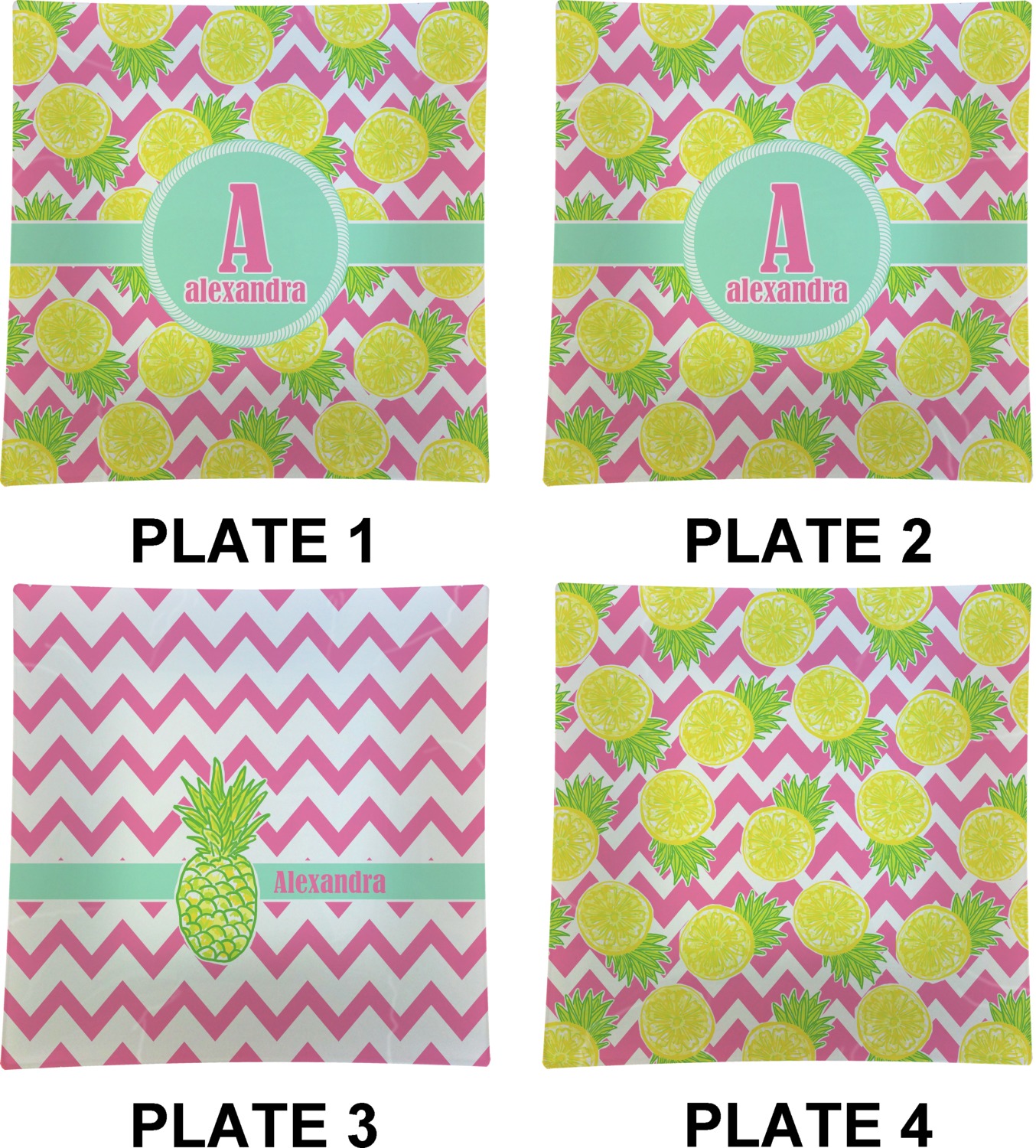 The main design has a background with bright pink and white chevron with some crazy yellow and lime pineapple slices scattered on top. A soft mint color is used for the ribbon and label, while a pink is used for the personalized name and initial.