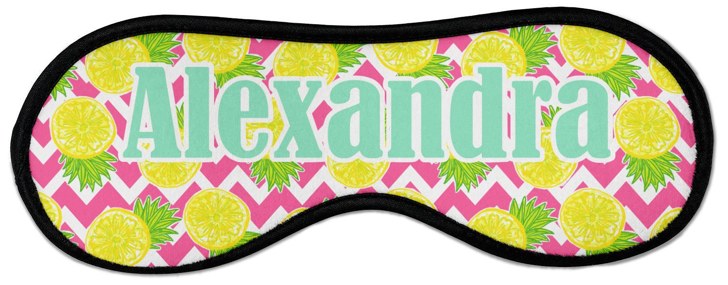 The main design has a background with bright pink and white chevron with some crazy yellow and lime pineapple slices scattered on top. A soft mint color is used for the ribbon and label, while a pink is used for the personalized name and initial.