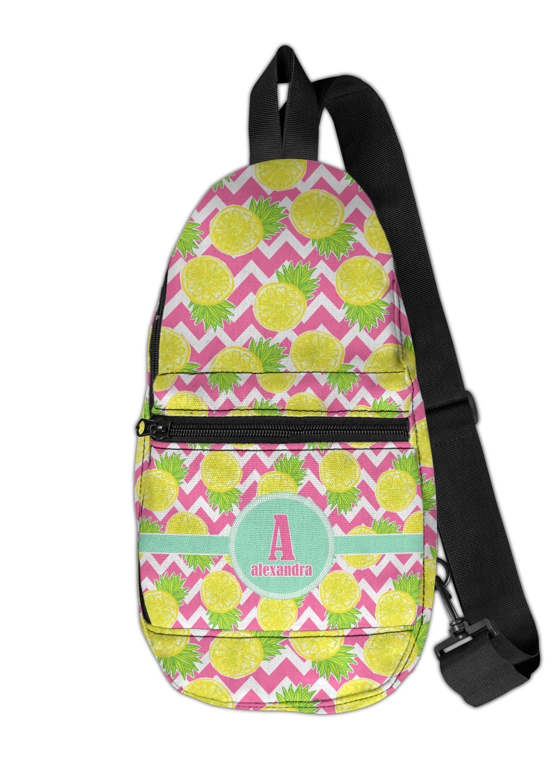 The main design has a background with bright pink and white chevron with some crazy yellow and lime pineapple slices scattered on top. A soft mint color is used for the ribbon and label, while a pink is used for the personalized name and initial.