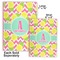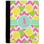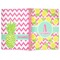 The main design has a background with bright pink and white chevron with some crazy yellow and lime pineapple slices scattered on top. A soft mint color is used for the ribbon and label, while a pink is used for the personalized name and initial.
