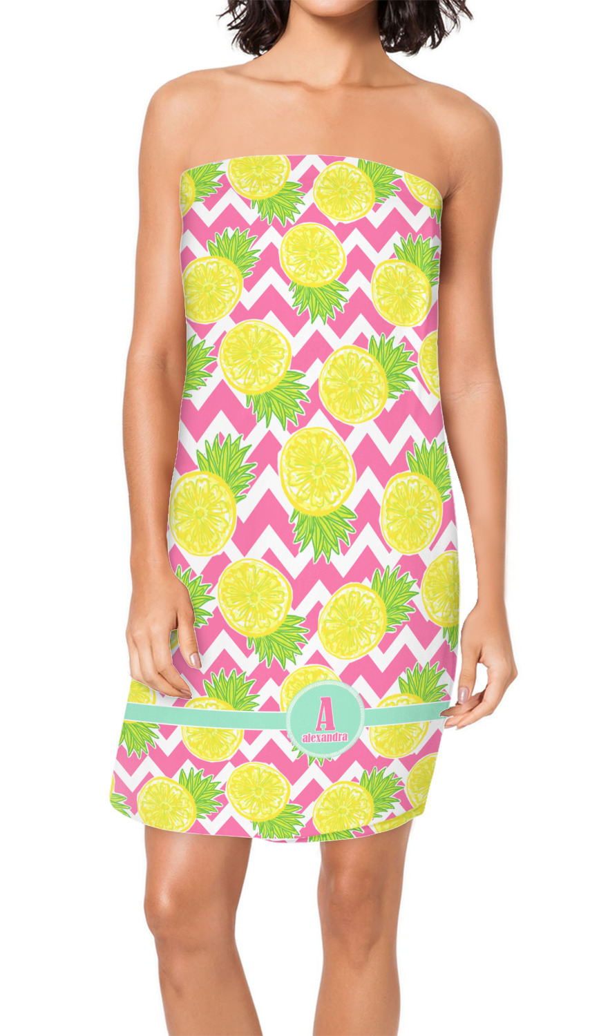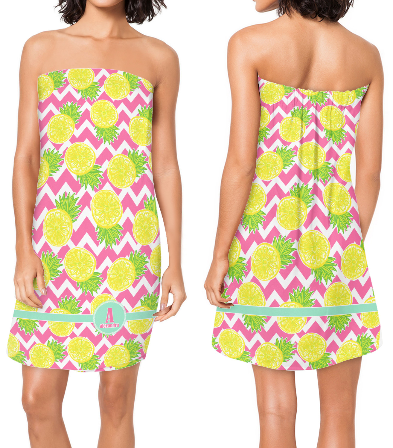 The main design has a background with bright pink and white chevron with some crazy yellow and lime pineapple slices scattered on top. A soft mint color is used for the ribbon and label, while a pink is used for the personalized name and initial.
