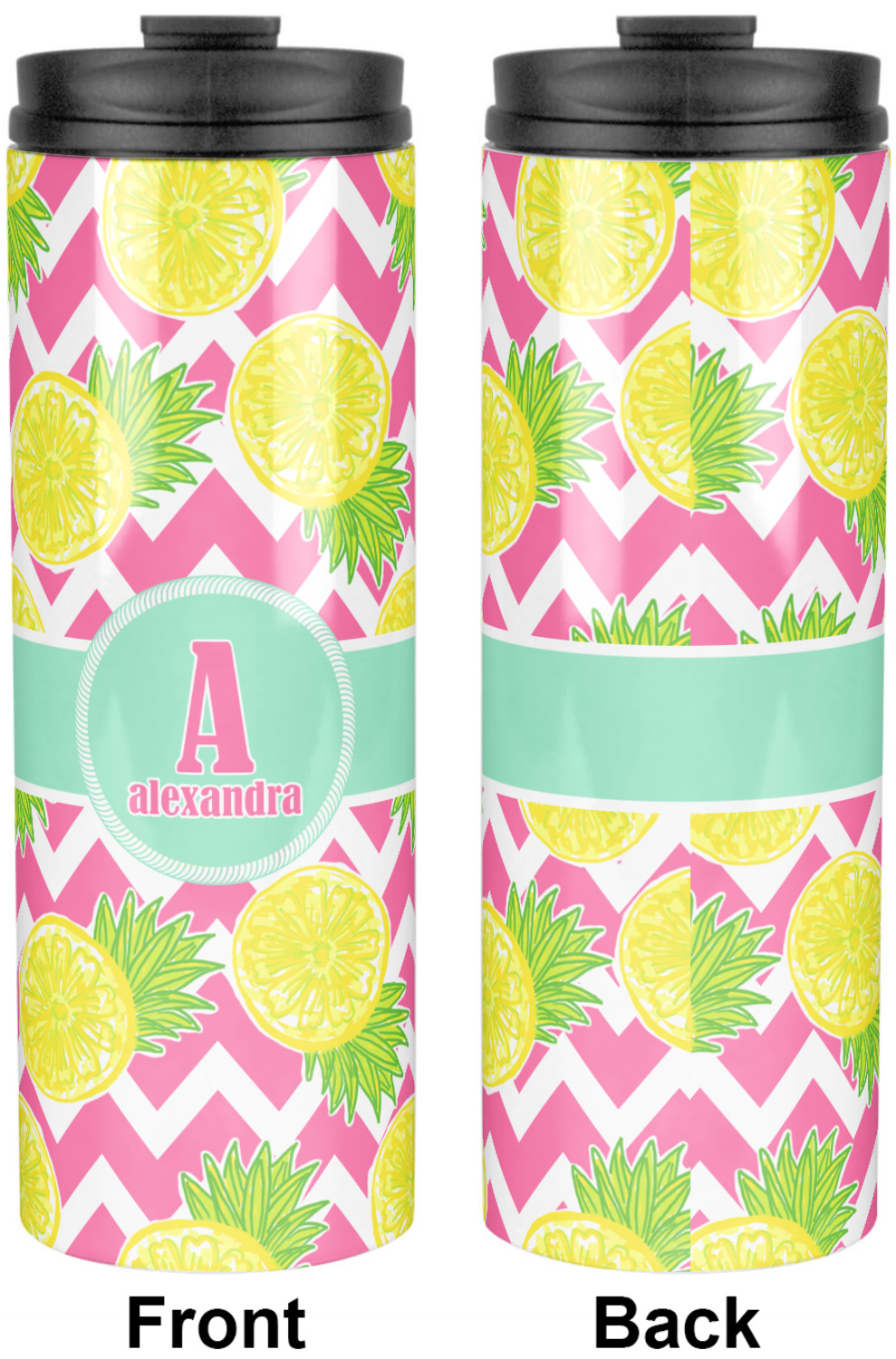 The main design has a background with bright pink and white chevron with some crazy yellow and lime pineapple slices scattered on top. A soft mint color is used for the ribbon and label, while a pink is used for the personalized name and initial.