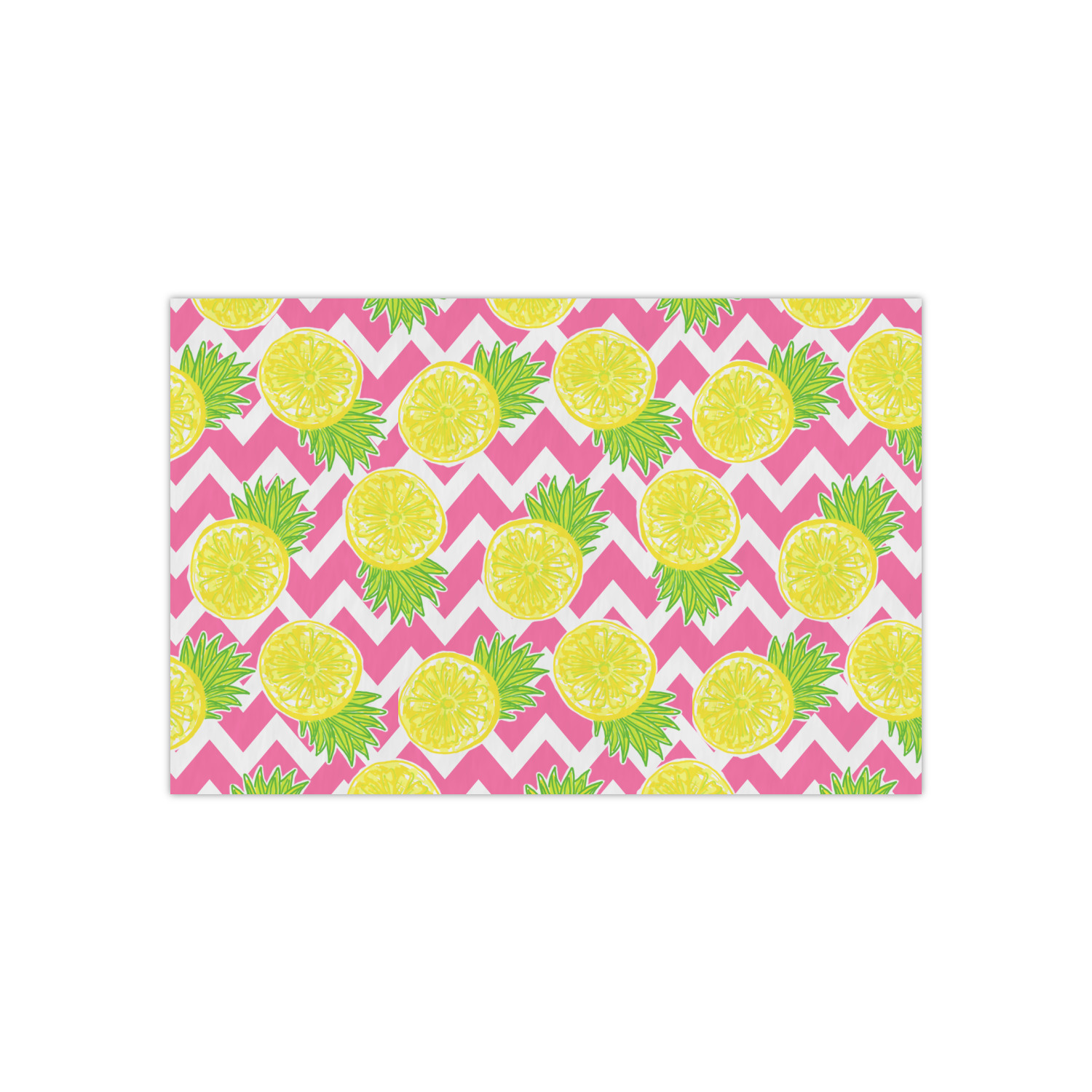 The main design has a background with bright pink and white chevron with some crazy yellow and lime pineapple slices scattered on top. A soft mint color is used for the ribbon and label, while a pink is used for the personalized name and initial.