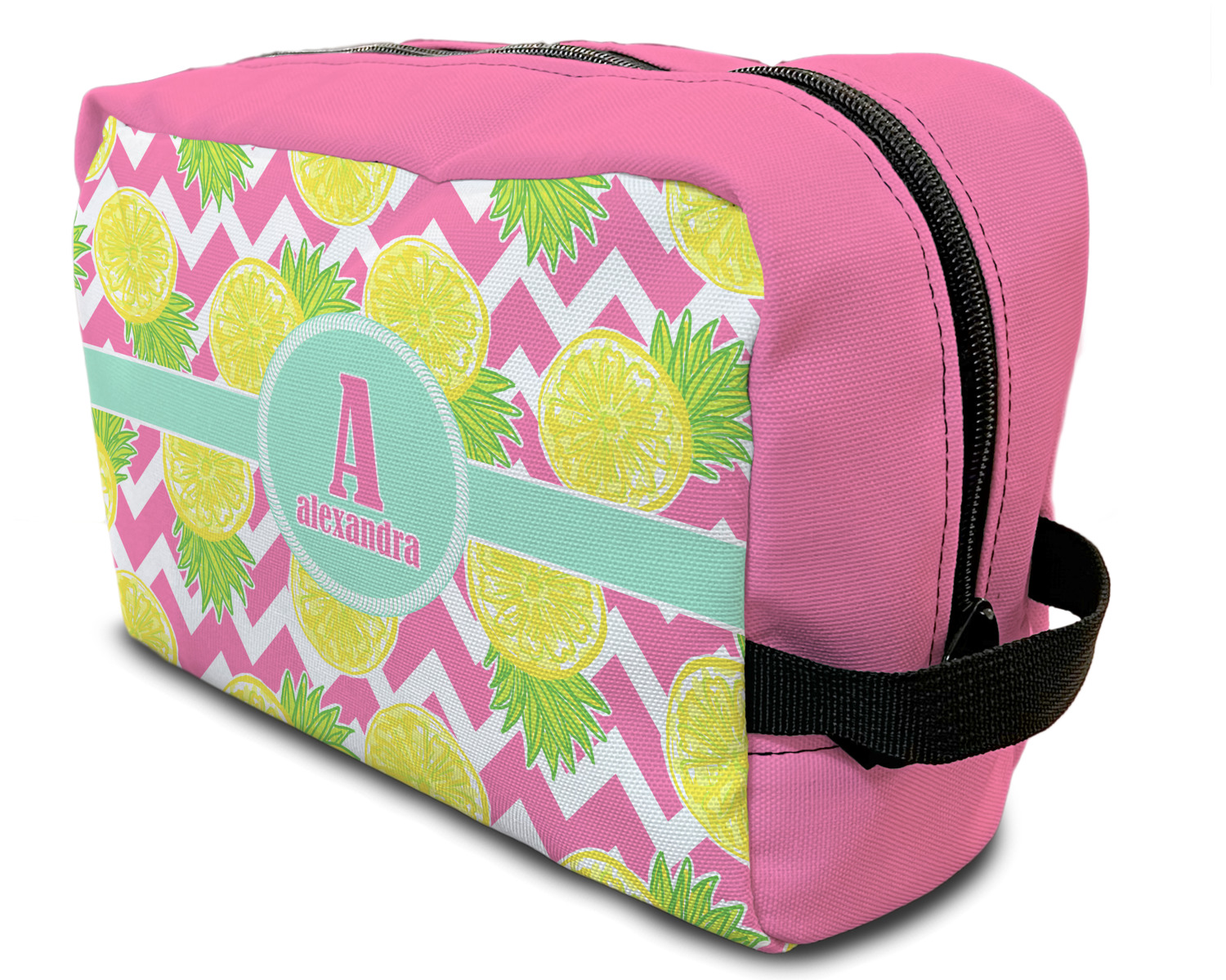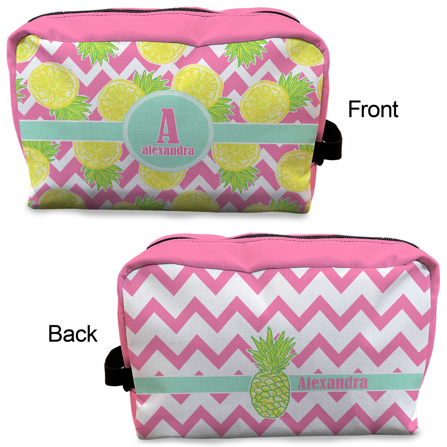 The main design has a background with bright pink and white chevron with some crazy yellow and lime pineapple slices scattered on top. A soft mint color is used for the ribbon and label, while a pink is used for the personalized name and initial.