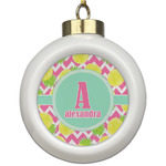 The main design has a background with bright pink and white chevron with some crazy yellow and lime pineapple slices scattered on top. A soft mint color is used for the ribbon and label, while a pink is used for the personalized name and initial.