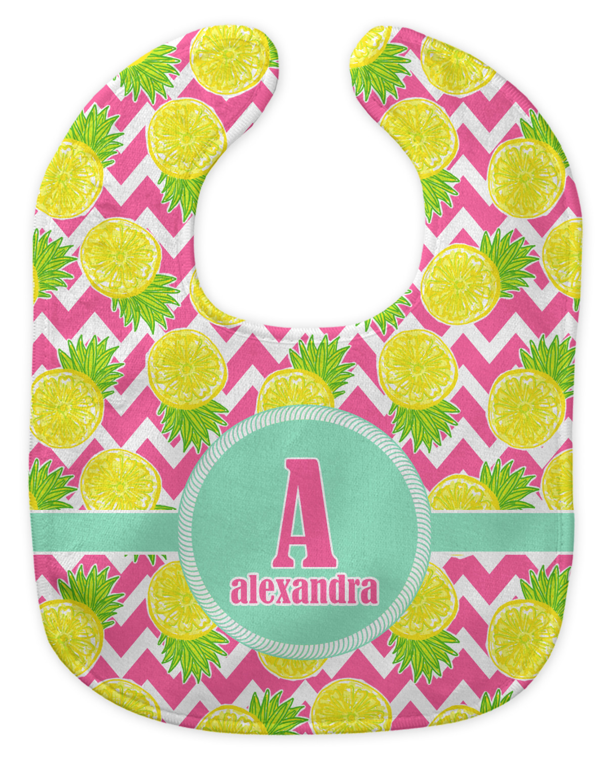The main design has a background with bright pink and white chevron with some crazy yellow and lime pineapple slices scattered on top. A soft mint color is used for the ribbon and label, while a pink is used for the personalized name and initial.