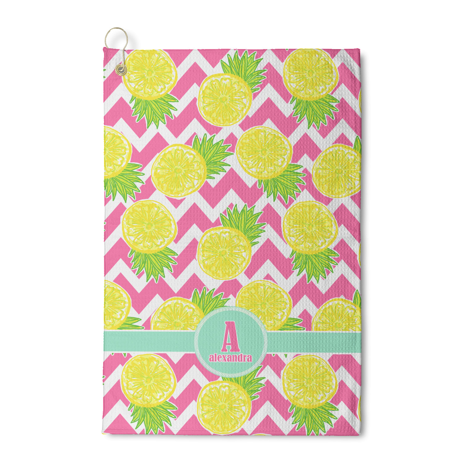 The main design has a background with bright pink and white chevron with some crazy yellow and lime pineapple slices scattered on top. A soft mint color is used for the ribbon and label, while a pink is used for the personalized name and initial.