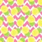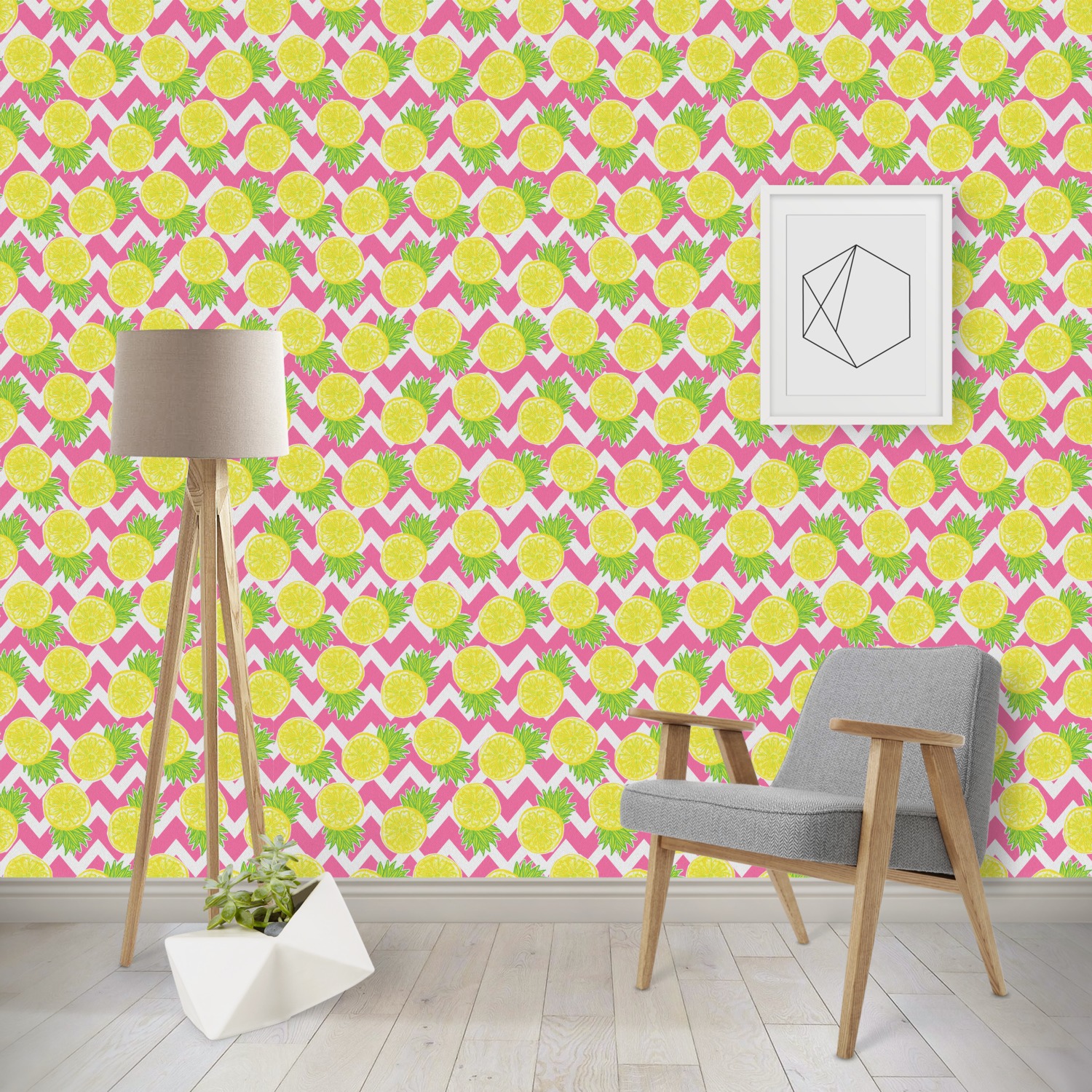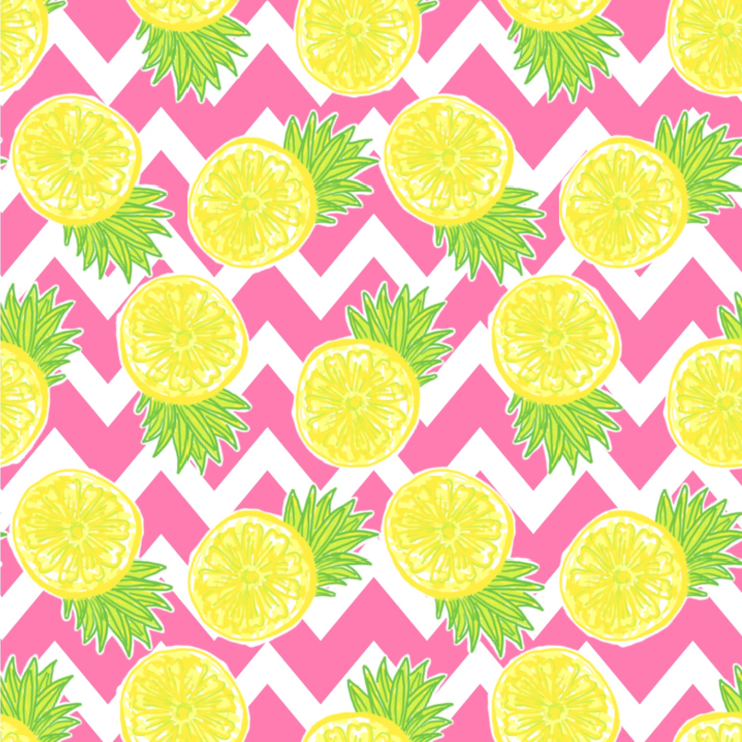 The main design has a background with bright pink and white chevron with some crazy yellow and lime pineapple slices scattered on top. A soft mint color is used for the ribbon and label, while a pink is used for the personalized name and initial.