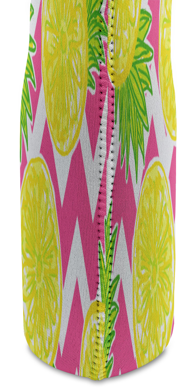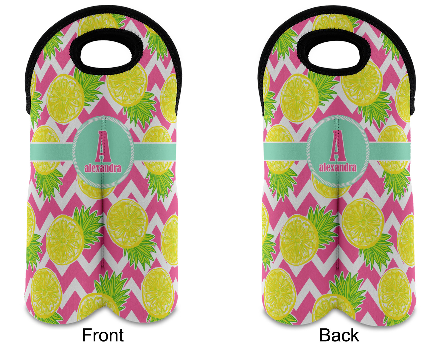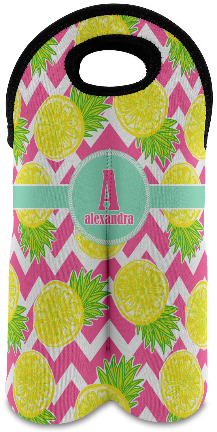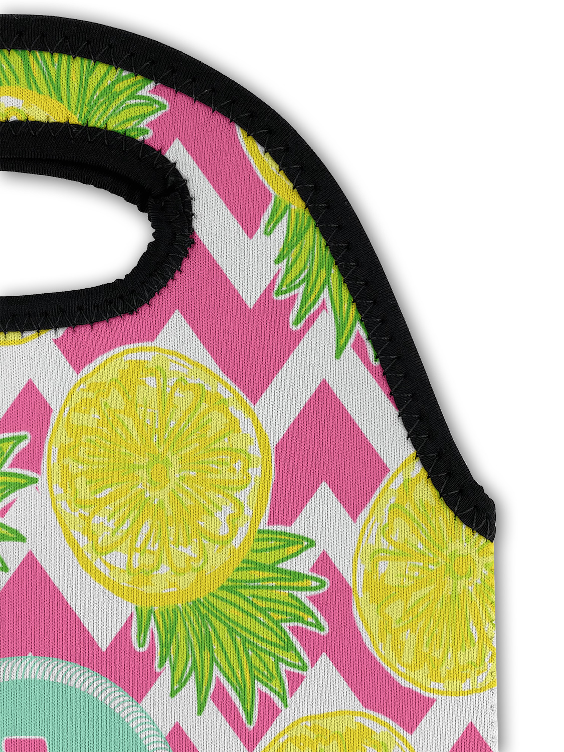 The main design has a background with bright pink and white chevron with some crazy yellow and lime pineapple slices scattered on top. A soft mint color is used for the ribbon and label, while a pink is used for the personalized name and initial.