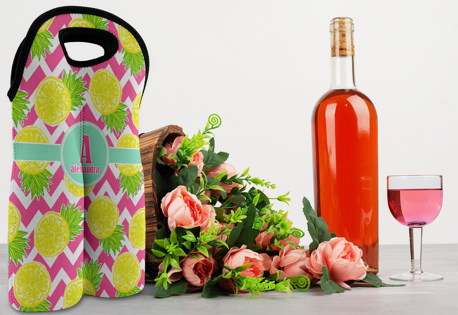 These tote bags are insulated to keep the bottles cold and have a stitched separation down the middle and double handles to keep the two bottles safe and secure during travels.