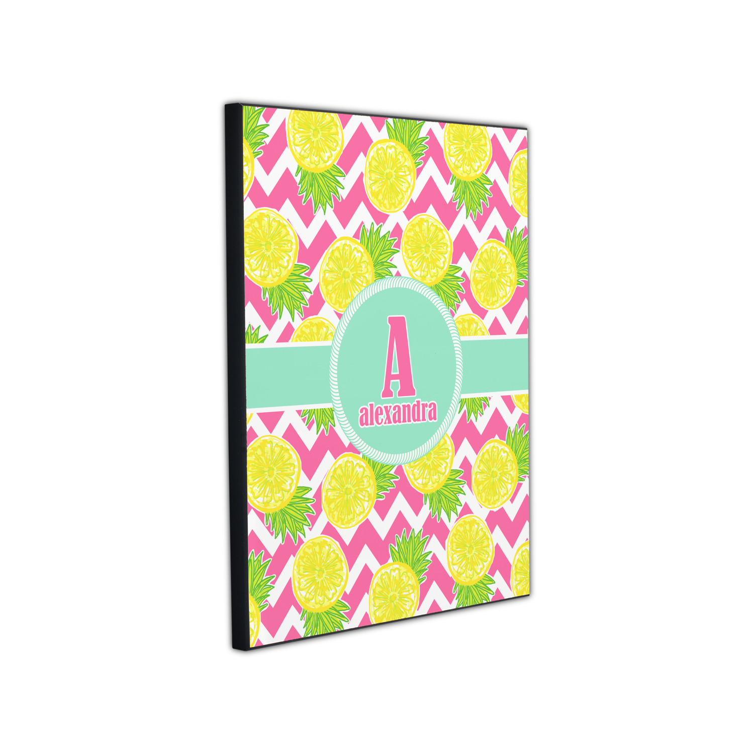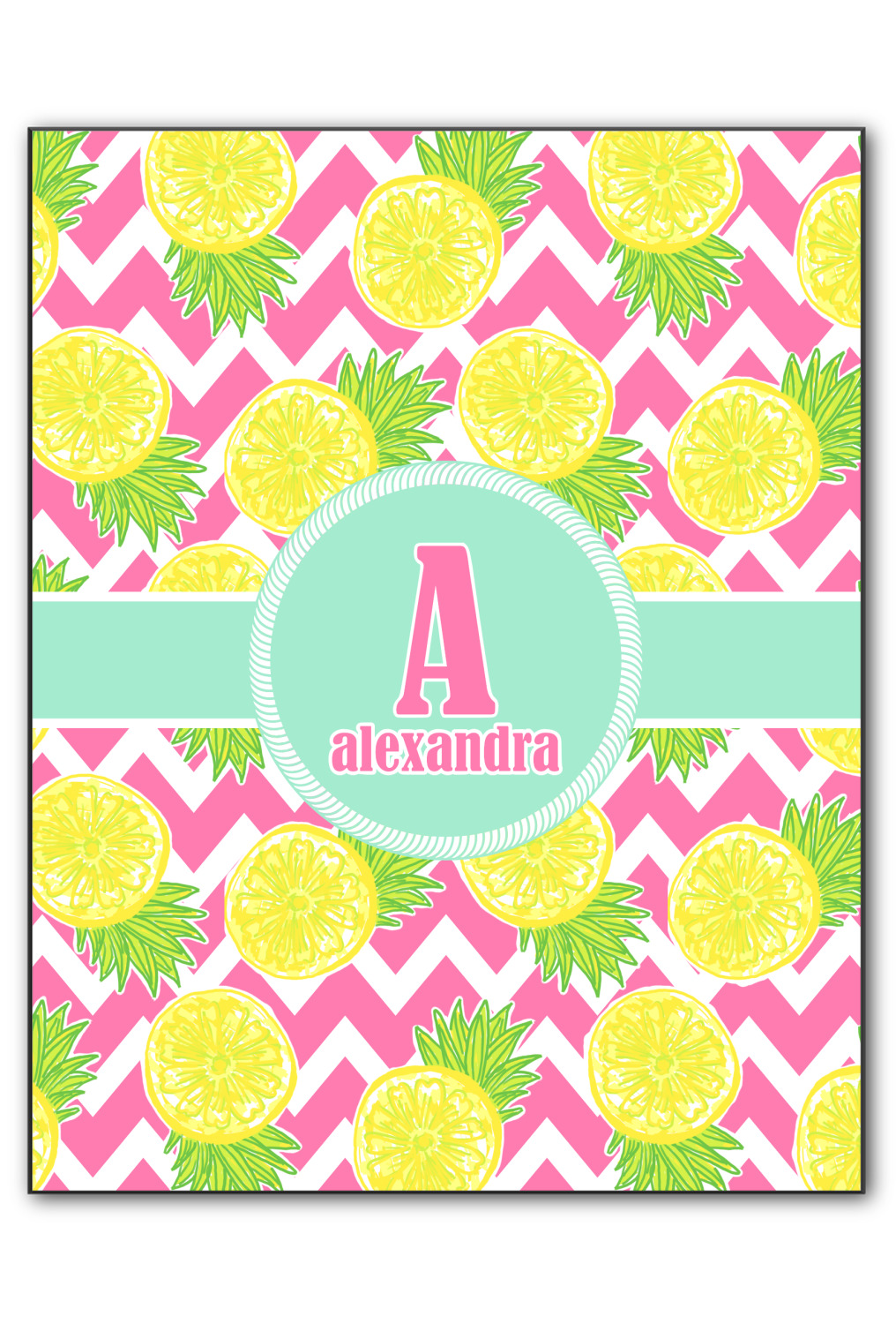 The main design has a background with bright pink and white chevron with some crazy yellow and lime pineapple slices scattered on top. A soft mint color is used for the ribbon and label, while a pink is used for the personalized name and initial.