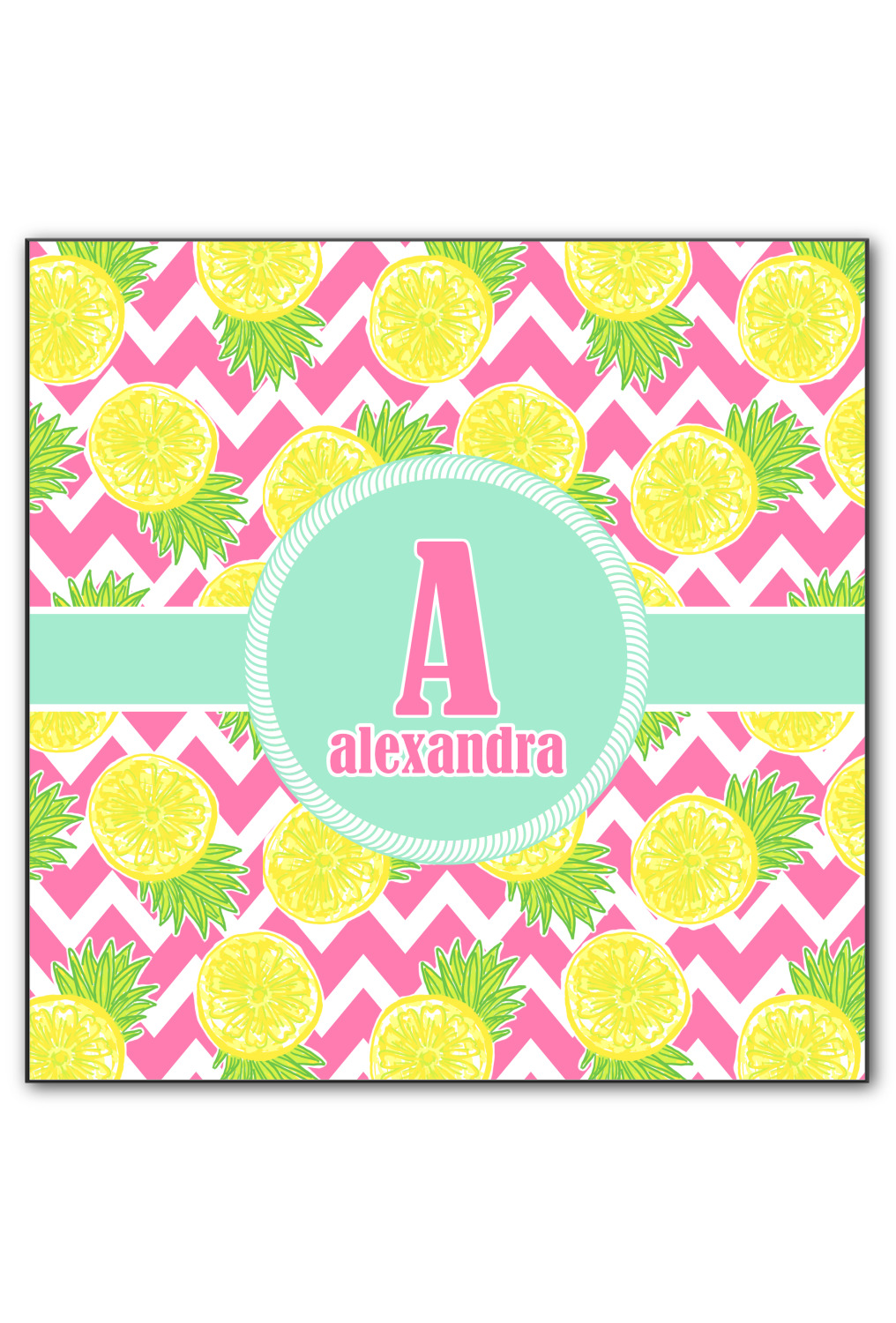 The main design has a background with bright pink and white chevron with some crazy yellow and lime pineapple slices scattered on top. A soft mint color is used for the ribbon and label, while a pink is used for the personalized name and initial.