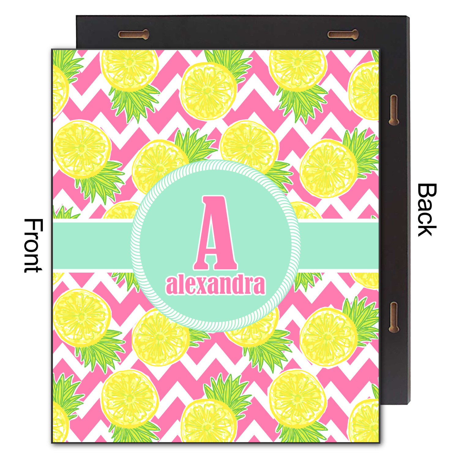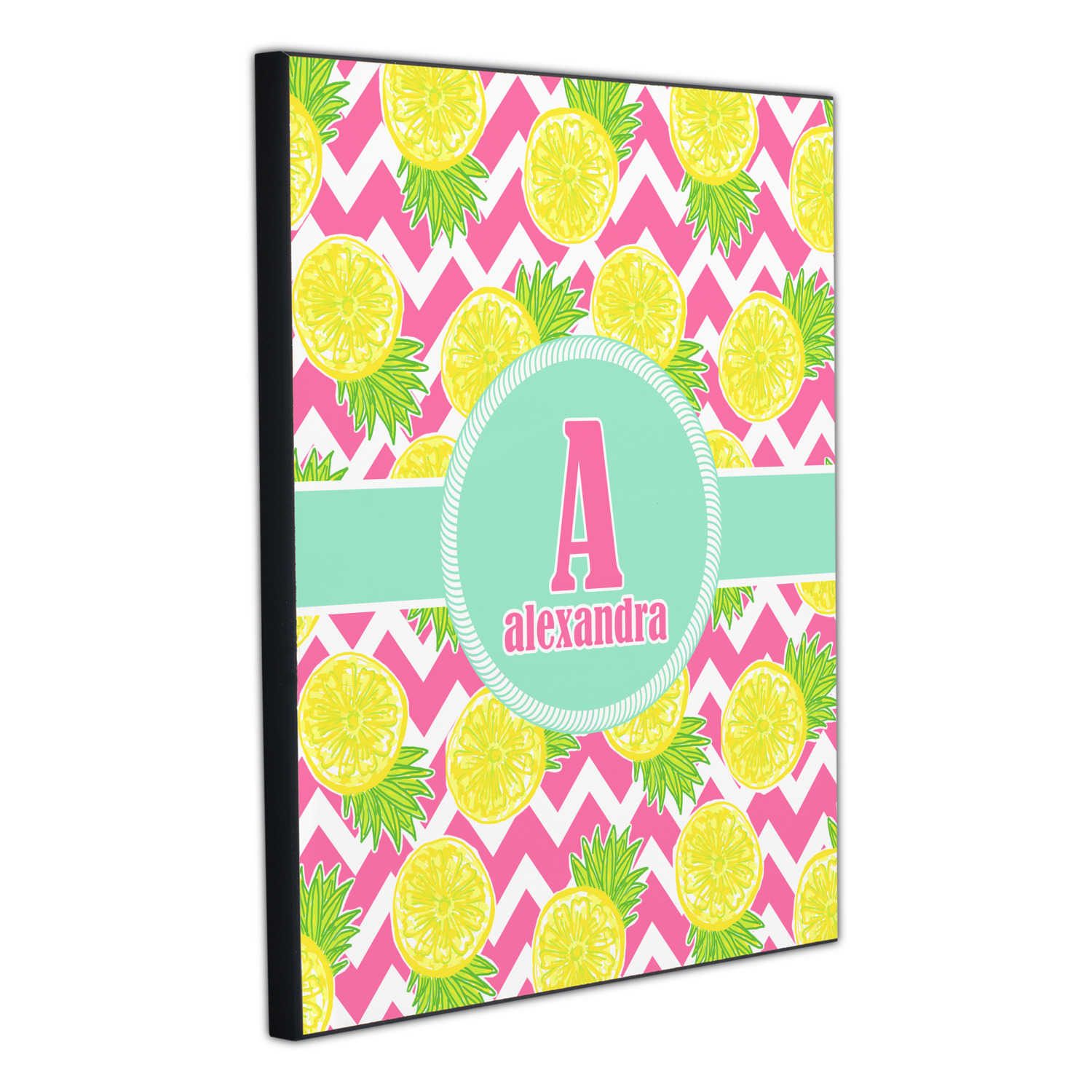 The main design has a background with bright pink and white chevron with some crazy yellow and lime pineapple slices scattered on top. A soft mint color is used for the ribbon and label, while a pink is used for the personalized name and initial.