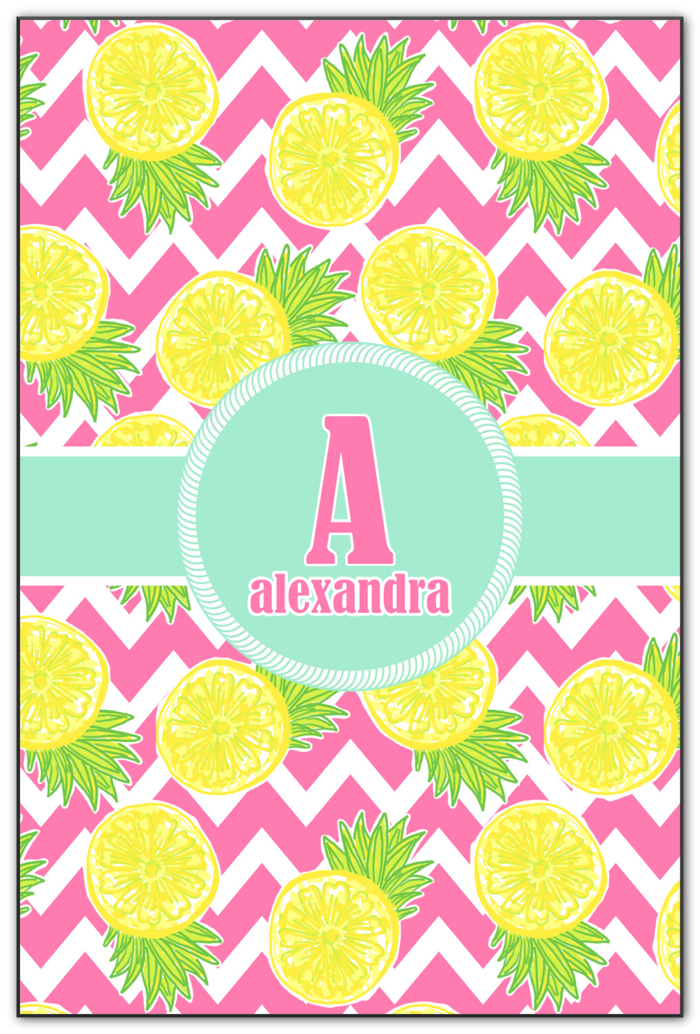 The main design has a background with bright pink and white chevron with some crazy yellow and lime pineapple slices scattered on top. A soft mint color is used for the ribbon and label, while a pink is used for the personalized name and initial.