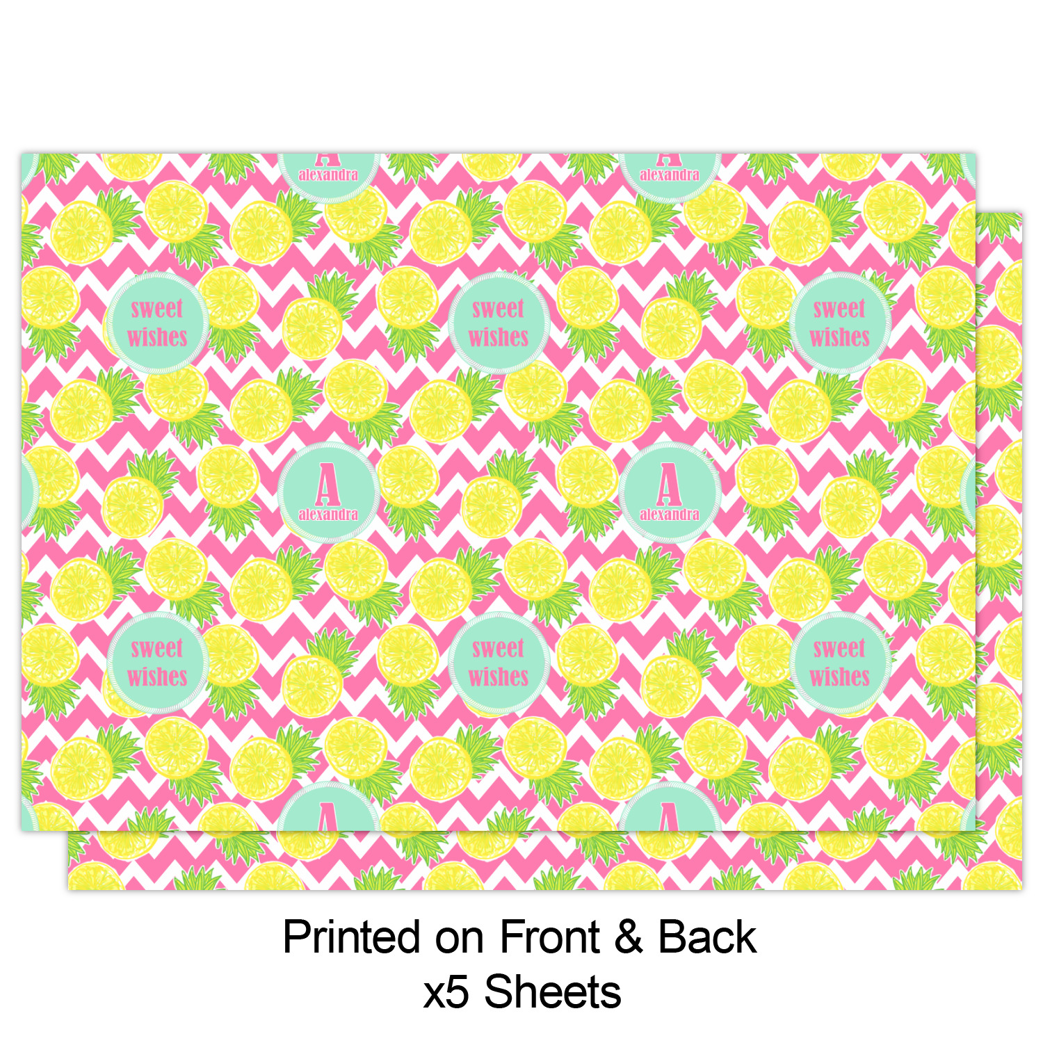The main design has a background with bright pink and white chevron with some crazy yellow and lime pineapple slices scattered on top. A soft mint color is used for the ribbon and label, while a pink is used for the personalized name and initial.
