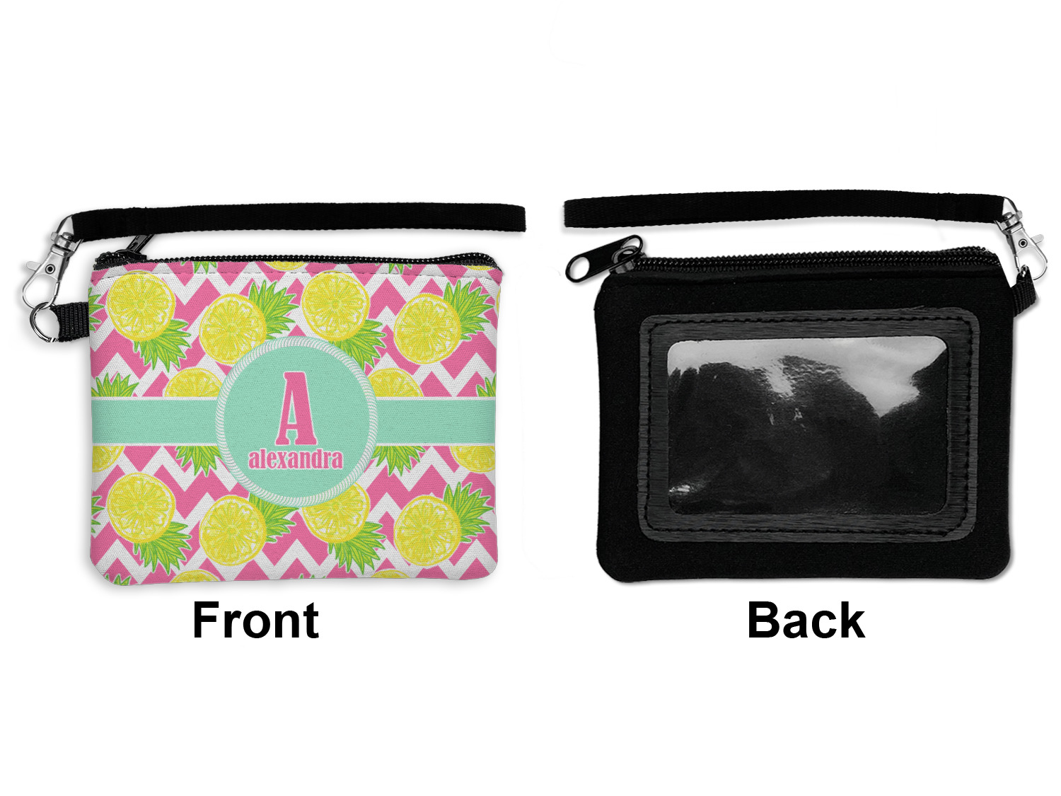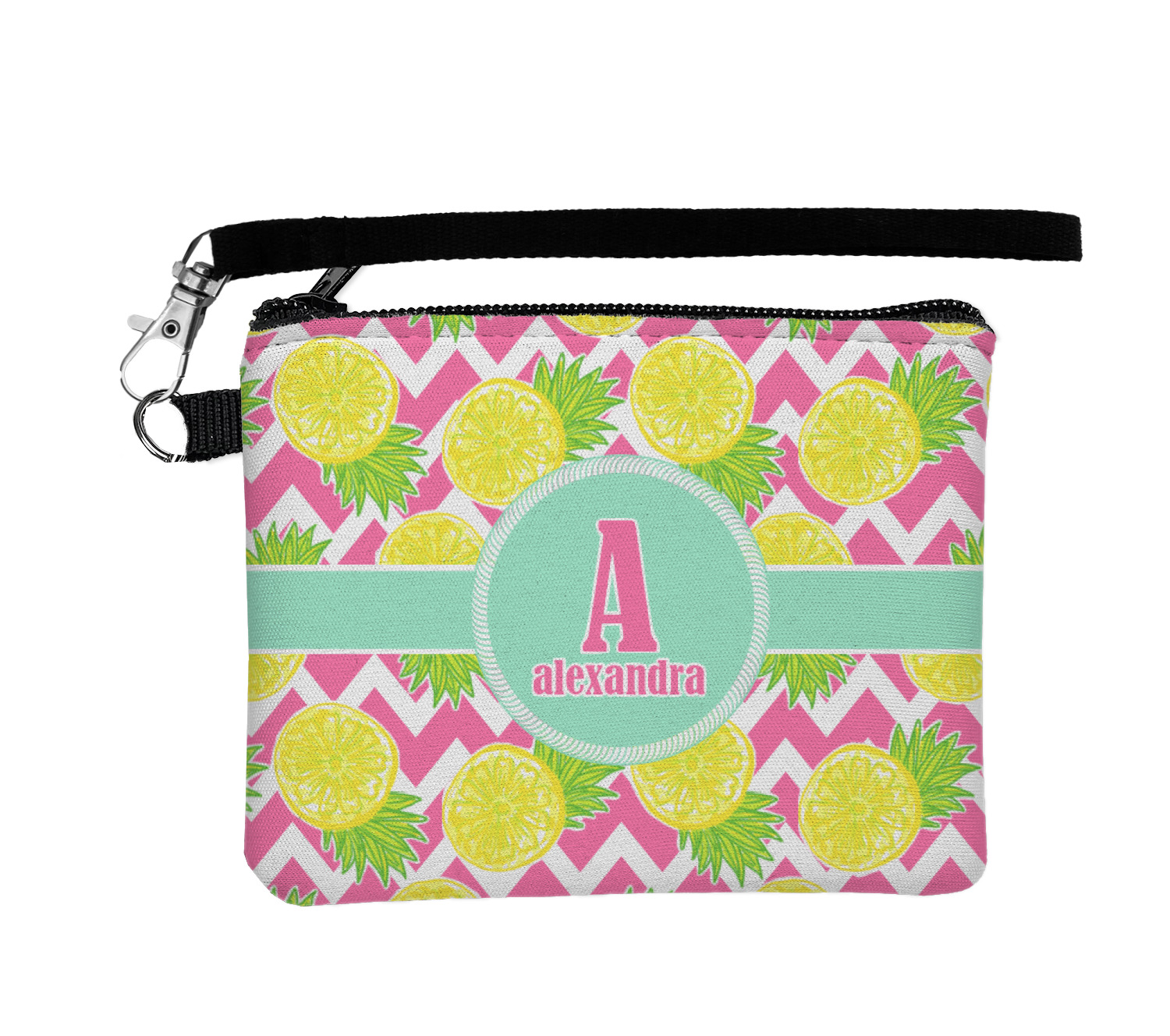 The main design has a background with bright pink and white chevron with some crazy yellow and lime pineapple slices scattered on top. A soft mint color is used for the ribbon and label, while a pink is used for the personalized name and initial.