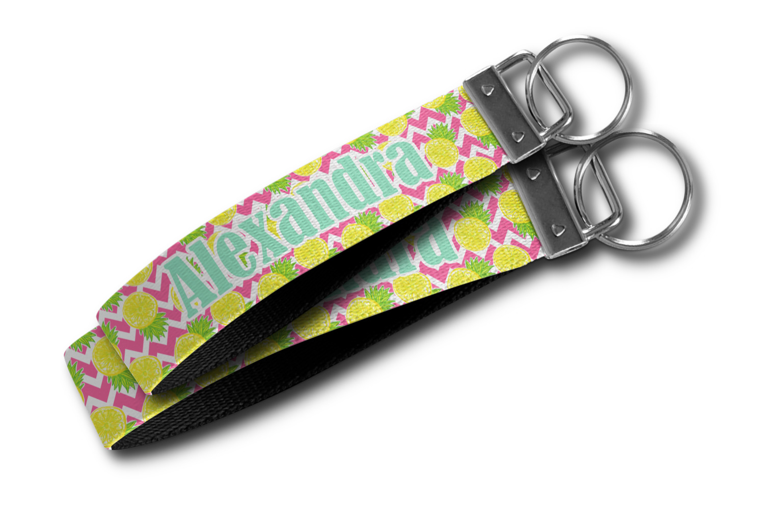 The main design has a background with bright pink and white chevron with some crazy yellow and lime pineapple slices scattered on top. A soft mint color is used for the ribbon and label, while a pink is used for the personalized name and initial.
