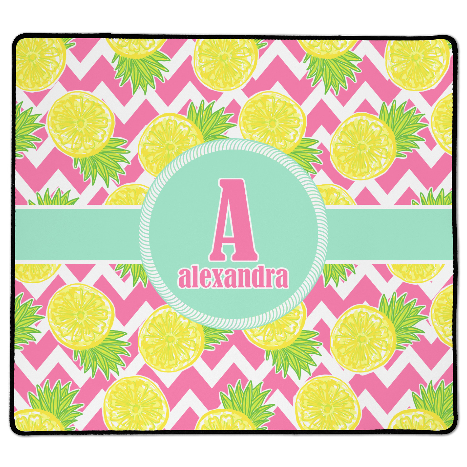 The main design has a background with bright pink and white chevron with some crazy yellow and lime pineapple slices scattered on top. A soft mint color is used for the ribbon and label, while a pink is used for the personalized name and initial.