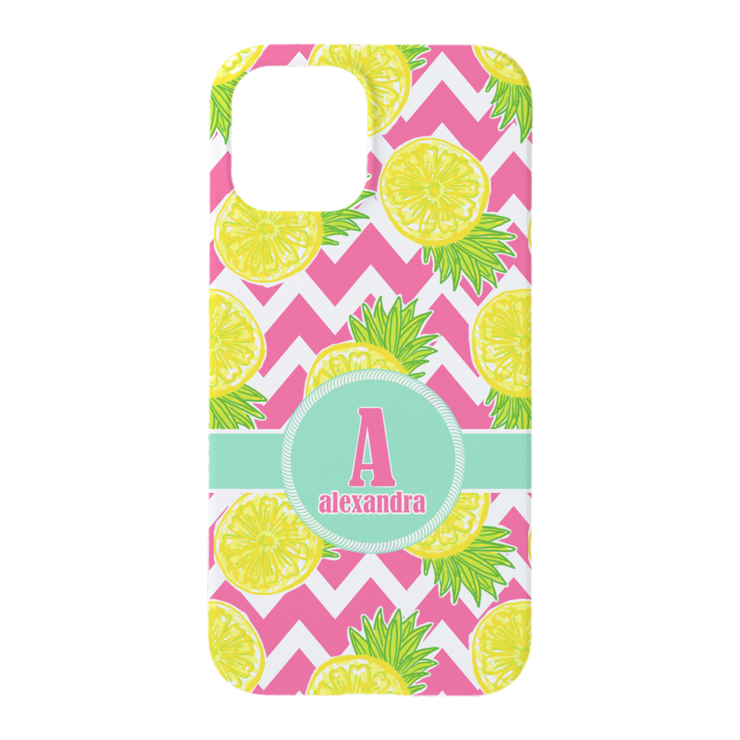 The main design has a background with bright pink and white chevron with some crazy yellow and lime pineapple slices scattered on top. A soft mint color is used for the ribbon and label, while a pink is used for the personalized name and initial.