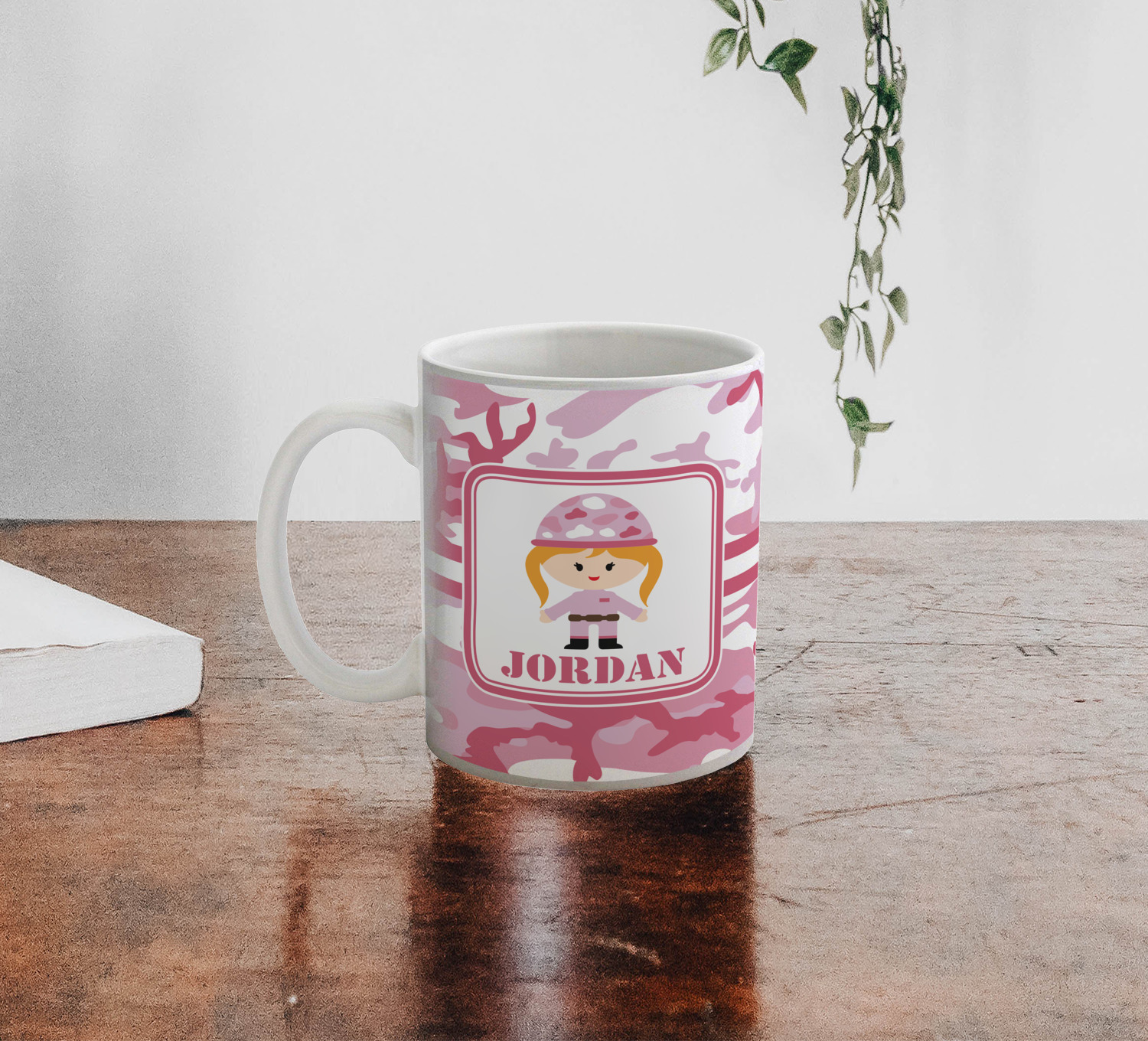 We have featured our little army girl, wearing her pink camo helmet, in the middle of the design in a pink and white square. A wide white band trimmed in pink tie everything together.