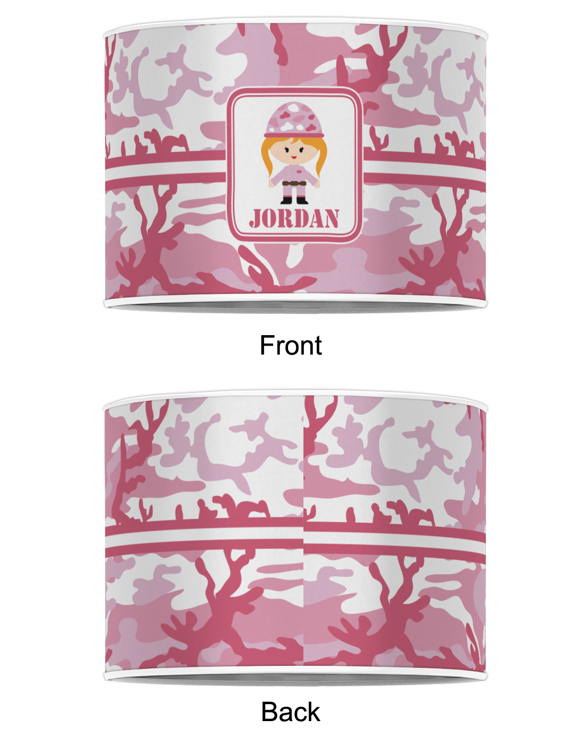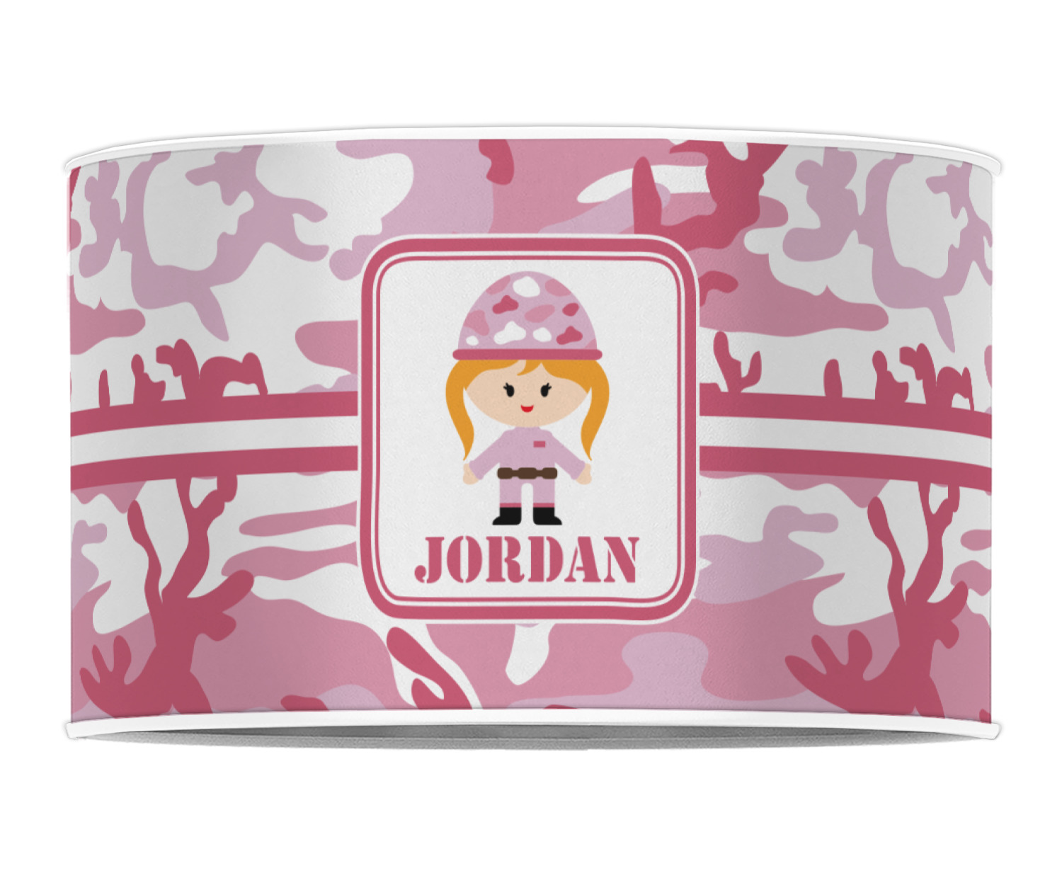 We have featured our little army girl, wearing her pink camo helmet, in the middle of the design in a pink and white square. A wide white band trimmed in pink tie everything together.