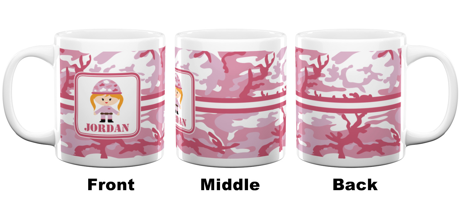 We have featured our little army girl, wearing her pink camo helmet, in the middle of the design in a pink and white square. A wide white band trimmed in pink tie everything together.