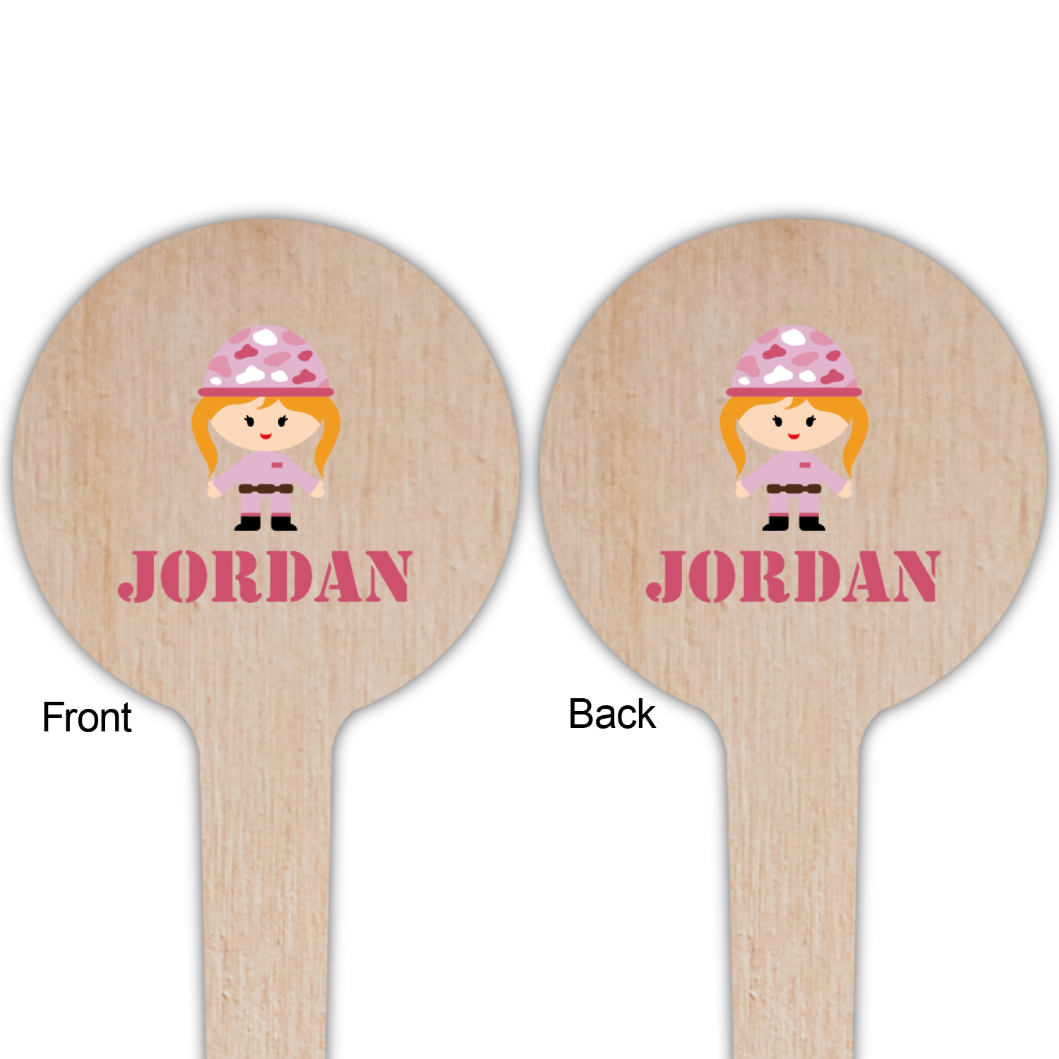 We have featured our little army girl, wearing her pink camo helmet, in the middle of the design in a pink and white square. A wide white band trimmed in pink tie everything together.