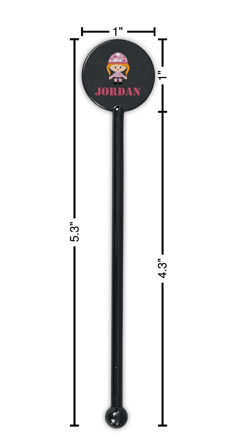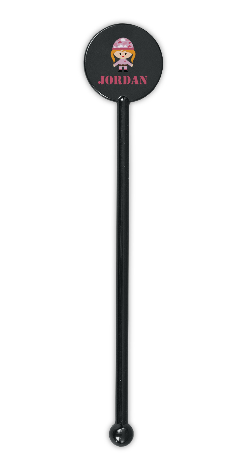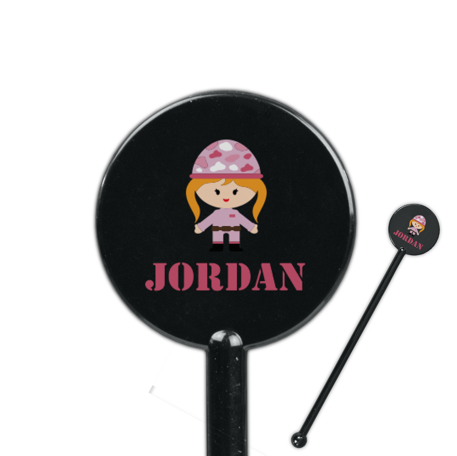 We have featured our little army girl, wearing her pink camo helmet, in the middle of the design in a pink and white square. A wide white band trimmed in pink tie everything together.