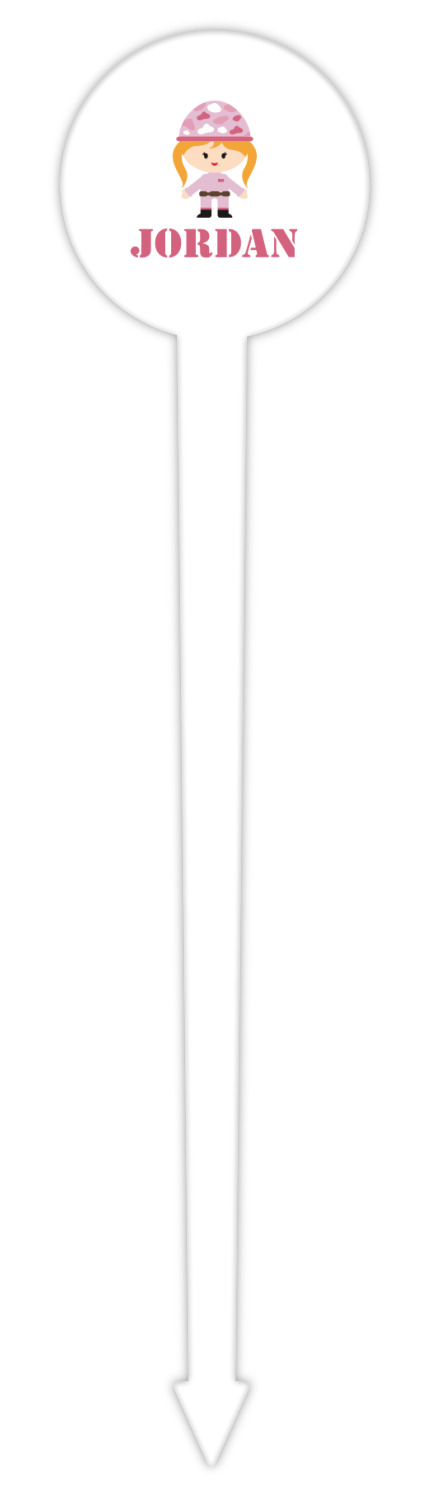 We have featured our little army girl, wearing her pink camo helmet, in the middle of the design in a pink and white square. A wide white band trimmed in pink tie everything together.