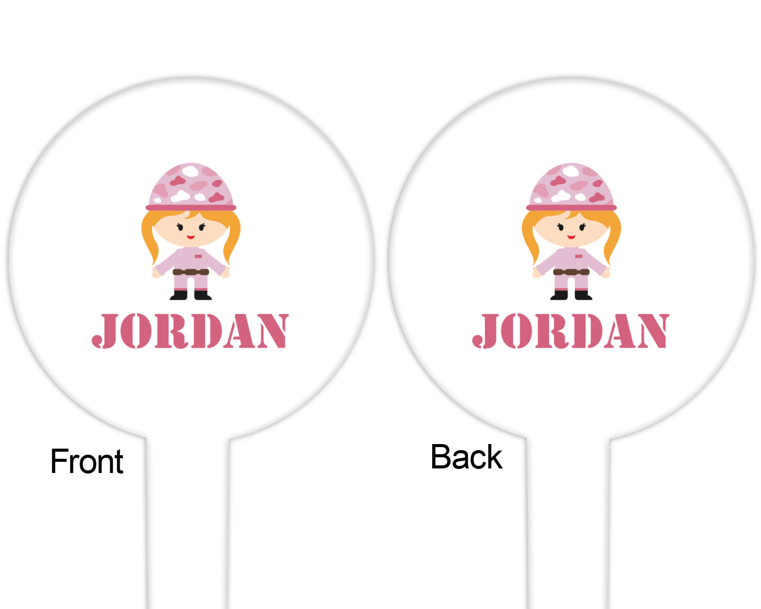 We have featured our little army girl, wearing her pink camo helmet, in the middle of the design in a pink and white square. A wide white band trimmed in pink tie everything together.