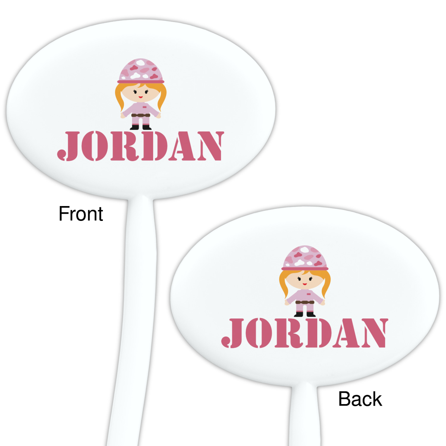 We have featured our little army girl, wearing her pink camo helmet, in the middle of the design in a pink and white square. A wide white band trimmed in pink tie everything together.
