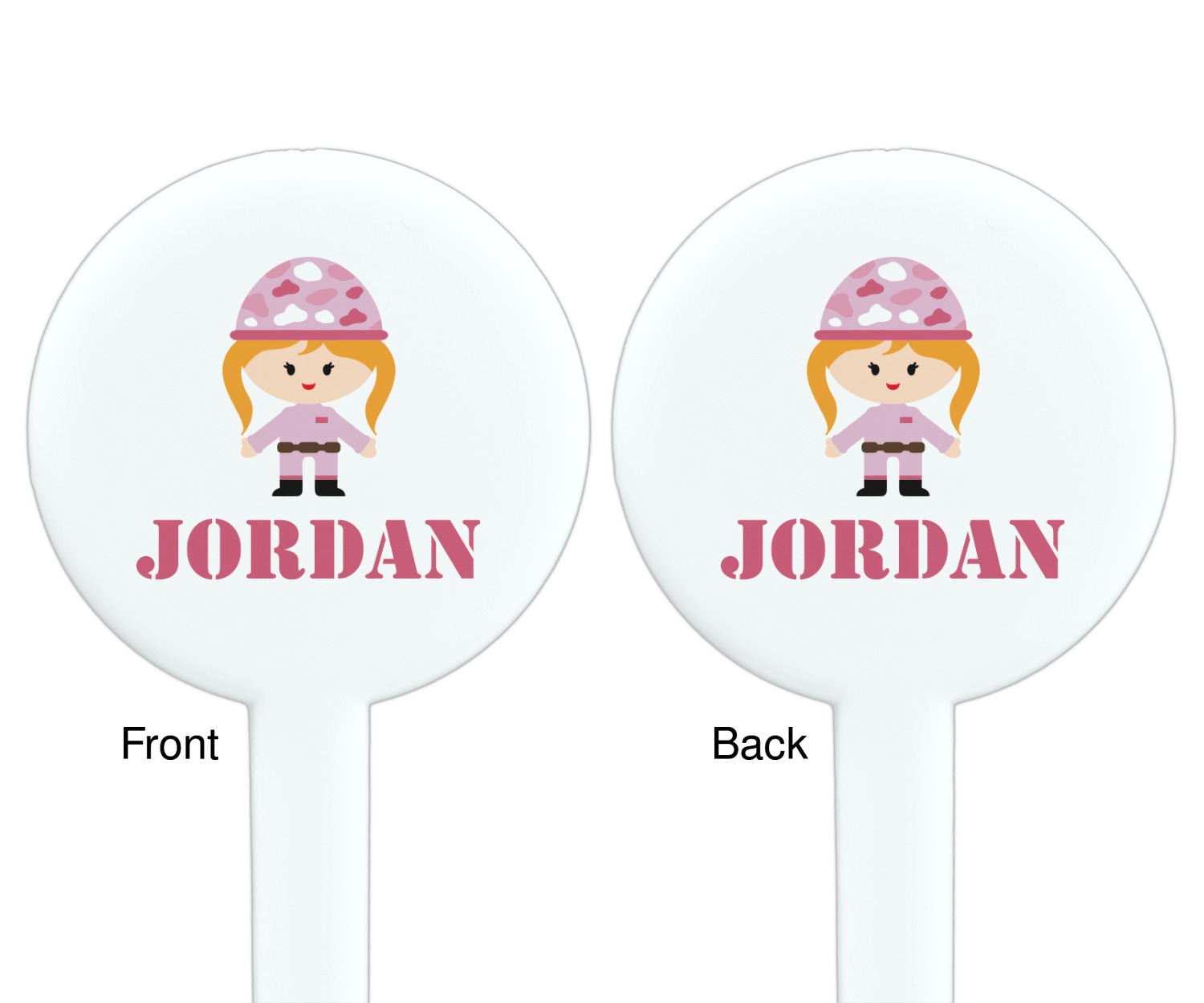 We have featured our little army girl, wearing her pink camo helmet, in the middle of the design in a pink and white square. A wide white band trimmed in pink tie everything together.