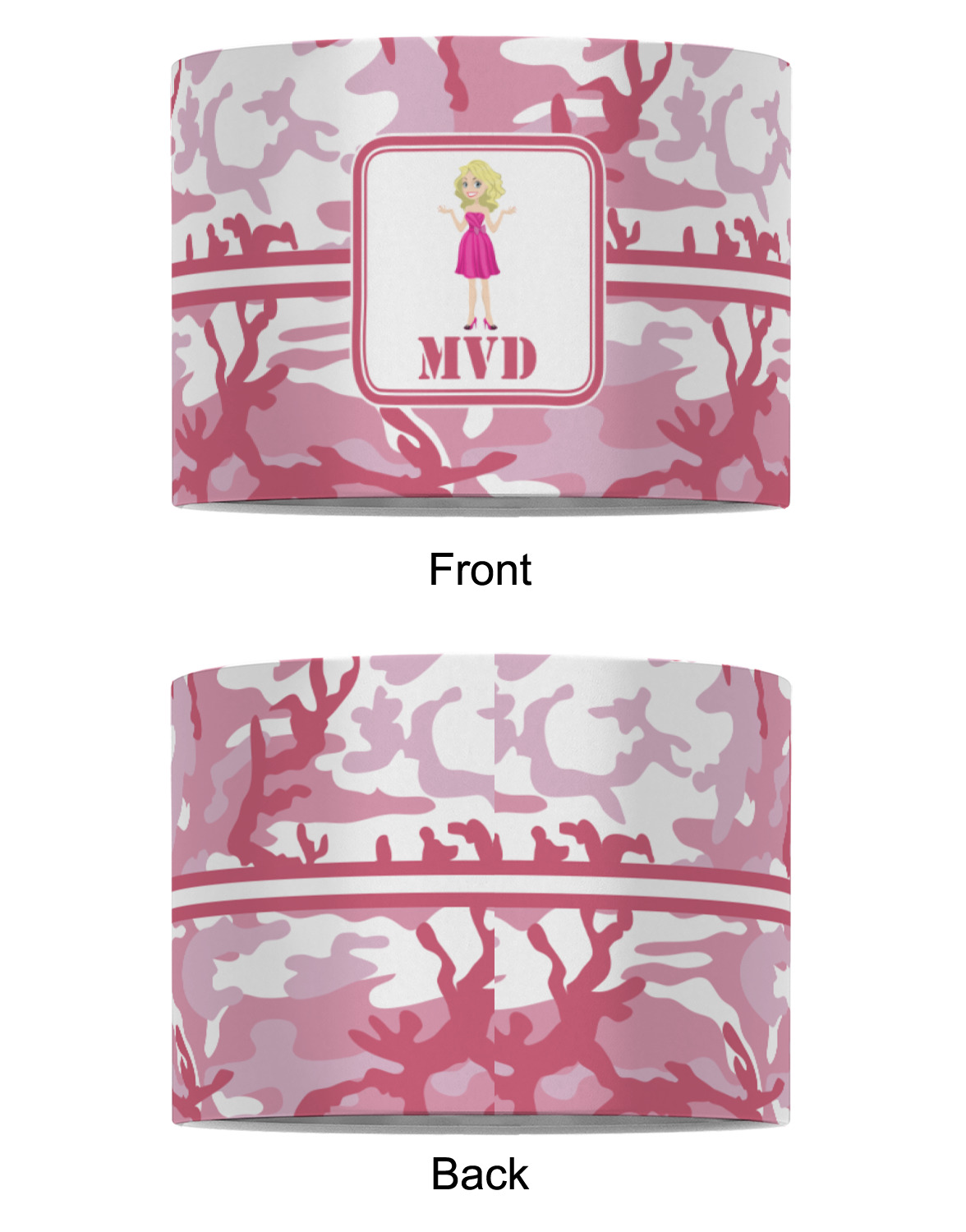 We have featured our little army girl, wearing her pink camo helmet, in the middle of the design in a pink and white square. A wide white band trimmed in pink tie everything together.